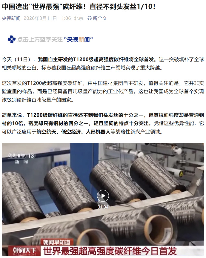 钓鱼佬的福音来了!中国超高强度碳纤维实现重大突破,T1200级超高强度碳纤维全球首次实现量产,拉伸强度突破8000兆帕,以后大家上鱼不会断杆了~