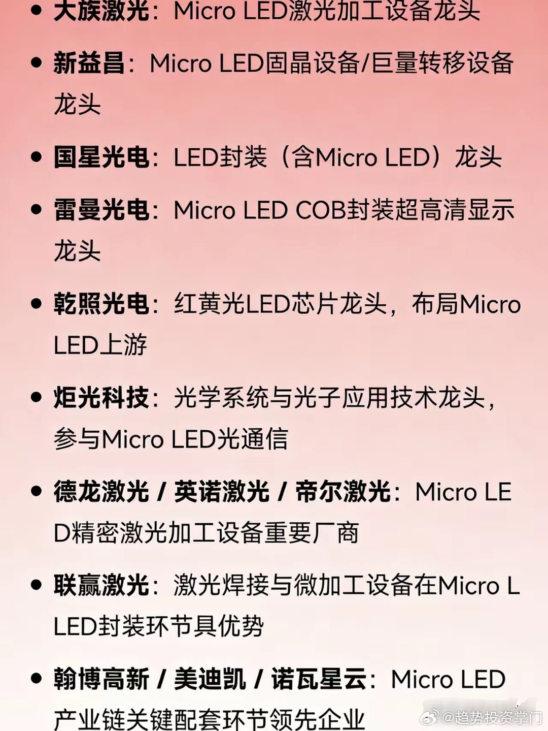 Micro LED产业链龙头上游芯片三安光电、华灿光电、乾照光电中游封装聚飞光电、国星光电、雷曼光电、兆驰股份下游显示利亚德、洲明科技、京东方A设备与配套大族激光、新益昌、德龙激光、英诺激光、帝尔激光、联赢激光、炬光科技、翰博高新、美迪凯、诺瓦星云