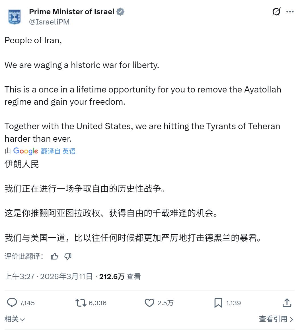 以色列总理又“发疯”了! 3月11日,以色列总理官方社交账号发文直接喊话伊朗民众:“伊朗人民,我们正在进行一场争取自由的历史性战争。这是你推翻阿亚图拉政权、获得自由的千载难逢的机会。我们与美国一道,比以往任何时候都更加严厉地打击德黑兰的暴君。” 他真把自己当成了拯救中东的救世主,却忘了自己手上沾满了无辜平民的鲜血,明明是他一手点燃中东战火、在整个地区四处树敌,现在居然摇身一变成了替伊朗人民争取自由的 “解放者”。 他对着伊朗民众说,这是推翻政权、获得自由的千载难逢的机会,还拉上美国一起,声称要严厉打击德黑兰的暴君,可他自己做的事,和暴君没有任何区别,甚至更加残忍。 就在他说这些漂亮话的时候,加沙地带的惨剧还在继续,根据加沙卫生部门最新的统计,从 2023 年 10 月新一轮冲突爆发到现在,以色列的军事行动已经造成72135 人死亡,171830 人受伤,这些数字里,七成以上都是手无寸铁的妇女和儿童。 联合国的救援人员一次次亲眼看到,以色列的炸弹落在医院、学校、难民营里,连联合国的办公设施都没能幸免,加沙的粮食、水、药品早就断供,上百万巴勒斯坦人无家可归,只能在废墟里忍饥挨饿,很多孩子还没来得及长大,就死在了轰炸里。 这就是内塔尼亚胡口中的 “争取自由”?他给加沙人民带来的不是自由,是死亡、饥饿和无尽的痛苦,一个在加沙制造了人道主义灾难的人,居然有脸谈解放和自由,这是我听过最荒唐、最冷血的笑话。 他在中东四处点火,早就把整个地区搅得鸡犬不宁,除了打压巴勒斯坦,他把矛头对准了叙利亚、黎巴嫩,现在又直接挑衅伊朗。 这些年,以色列一直在伊朗搞秘密破坏行动,2025 年 6 月,他下令发动 “纳尼亚行动”,派出特工和战机,一夜之间暗杀了伊朗 9 名顶尖核科学家,这些科学家只是在自己家里睡觉,就被残忍杀害,行动还造成了 71 名平民无辜伤亡,其中还有不少孩子。 他还频繁出动战机空袭伊朗的军事设施、油库、能源基地,直接轰炸伊朗首都德黑兰附近的关键设施,切断伊朗的民生根基,让普通伊朗民众的生活陷入困境。 他嘴上说尊重伊朗人民,行动上却在暗杀、轰炸、破坏,把伊朗的国家主权踩在脚下,这哪里是解放,分明是赤裸裸的侵略,是对一个主权国家最野蛮的干涉。 联合国宪章明确规定,不能干涉别国内政,不能用武力解决争端,可内塔尼亚胡完全无视国际法,想打谁就打谁,想杀谁就杀谁,这种疯狂的做派,就是中东局势越来越危险的根源。 内塔尼亚胡之所以敢这么嚣张,全靠美国在背后撑腰。从 2023 年 10 月巴以冲突爆发到 2025 年 9 月,短短两年时间,美国就给以色列提供了217 亿美元的军事援助。 2026 年 3 月,美国又以紧急情况为由,继续给以色列输送大批武器弹药,包括先进的战机、导弹、炸弹,这些武器没有用来保护平民,全都用在了轰炸加沙、袭击伊朗的行动里。 美国和以色列联手,把中东当成了他们的博弈棋盘,为了维护自己的霸权,不惜牺牲中东各国人民的生命和利益,内塔尼亚胡口中的 “自由战争”,本质上就是美以霸权的侵略战争,和伊朗人民的自由没有半点关系。 他还有一套最可笑的双重标准,以色列自己偷偷拥有核武器,却不允许伊朗和平利用核能,一次次造谣说伊朗发展核武器,以此为借口发动攻击,国际原子能机构多次证实,伊朗的核计划完全是和平用途,可内塔尼亚胡就是视而不见。 他只许自己拥有杀伤性武器,只许自己在中东发动战争,不许其他国家维护自己的安全,不许其他国家发展自己的事业,这种霸道的逻辑,就是强盗逻辑,这种人,不是疯子是什么。 伊朗人民有自己的历史,有自己的文化,有自己选择国家道路的权利,轮不到以色列和美国来指手画脚,更轮不到内塔尼亚胡来隔空指挥、煽动内乱。 伊朗民众看得很清楚,谁是真正制造灾难的人,谁是真正想破坏他们生活的人,内塔尼亚胡的蛊惑,根本不会得逞,只会让更多人看清他的真面目。 内塔尼亚胡的这番疯话,只会让中东的局势更加失控,只会让更多无辜的人失去生命,他不是什么救世主,而是中东和平的最大破坏者,是双手沾满鲜血的战争贩子。 历史是公正的,那些发动战争、残害平民的人,最终都会被钉在耻辱柱上,被人民抛弃。 中东的和平和自由,从来不是靠轰炸和侵略得来的,只能靠尊重国家主权、靠平等对话、靠相互理解,内塔尼亚胡如果不立刻停止他的疯狂行为,继续在错误的道路上走下去,等待他的,只会是永远的骂名和最终的失败。