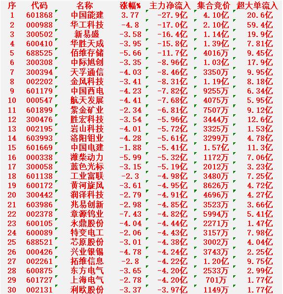 3月12日上午盘,主力趁低位,大幅买入的30名单 紫光股份:涨幅 +4.99%,主力净流入 8.86亿元 中国铝业:涨幅 +4.08%,主力净流入 8.62亿元 汉缆股份:涨幅 +9.96%(涨停),主力净流入 7.17亿元 杭钢股份:涨幅 +10.03%(涨停),主力净流入 6.84亿元 三安光电:涨幅 +7.28%,主力净流入 6.52亿元 3月12日中午收盘,主力资金“大幅卖出”的30名单: 中国能建:涨幅 +3.77%,主力净流入 -27.9亿元 华工科技:涨幅 -4.80%,主力净流入 -17.0亿元 新易盛:涨幅 -3.58%,主力净流入 -16.4亿元 华胜天成:涨幅 -3.95%,主力净流入 -15.8亿元 佰维存储:涨幅 -5.66%,主力净流入 -11.7亿元