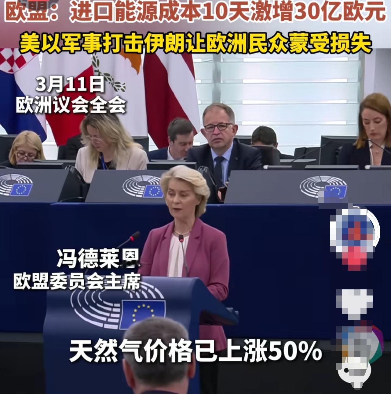 美以伊军事冲突,让欧盟这个美国的特殊盟友也彻底“嘣”“祝”了。 冯德莱恩在3月11号的欧盟理事会上说道, 10天的战争已经让欧洲进口成本激增30亿欧元,给欧洲各国的纳税人带来了沉重负担。 前几天看他们口是心非表达对特朗普的不满,也都在异口同声谴责伊朗反击的时候,我都觉得他们就是在搞笑,一丘之貉。现在他们竟然自身感到痛了,又开始念叨和平的珍贵。 双标一个词就是专门为他们发明的,历史轮转也没改变海盗本色野蛮习性,工业革命只是技术进步,只是金钱至上更明白更确凿,有些人为之迷恋的西方道德观和所谓的人权卫士,不堪一击,不值一驳,不屑一顾。 自信点吧,我的同胞,自强不息,我们强大起来就是世界的亮色!