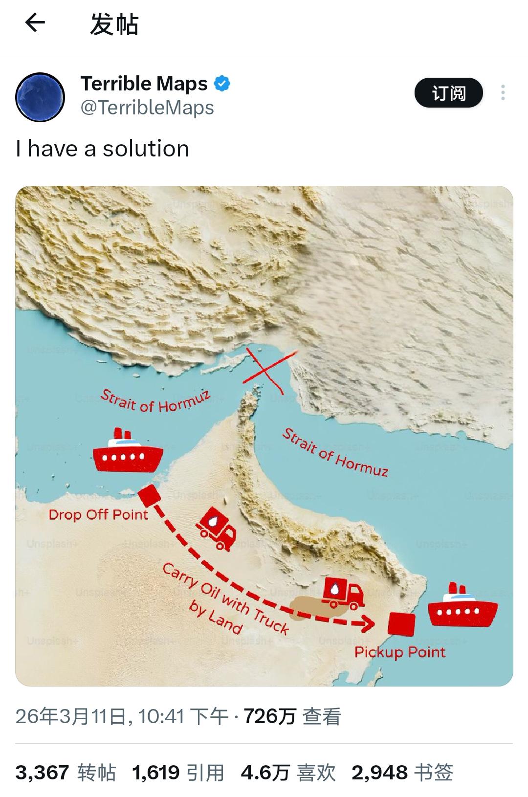 “天才的”解决方案! 有人画了个图,将霍尔木兹海峡拥堵难题一次解决:即在阿拉伯半岛上开一条输油专列(公路不可取,大塞车)。 技术上不是问题,要让PPT落地,阿拉伯缺的是什么?——就缺一个遇山开路、遇水架桥的谢灵运。 别说经济不经济的!“等”,从来不是谢灵运考虑的问题,那是对富豪钱包的羞辱! Source: X