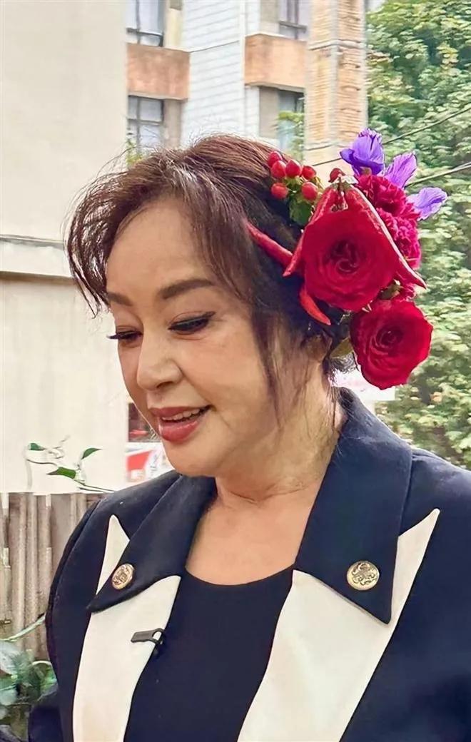 这两天刘晓庆在重庆吃火锅被拍,头顶大红花,假发片上还别着红辣椒,这造型着实吸睛。