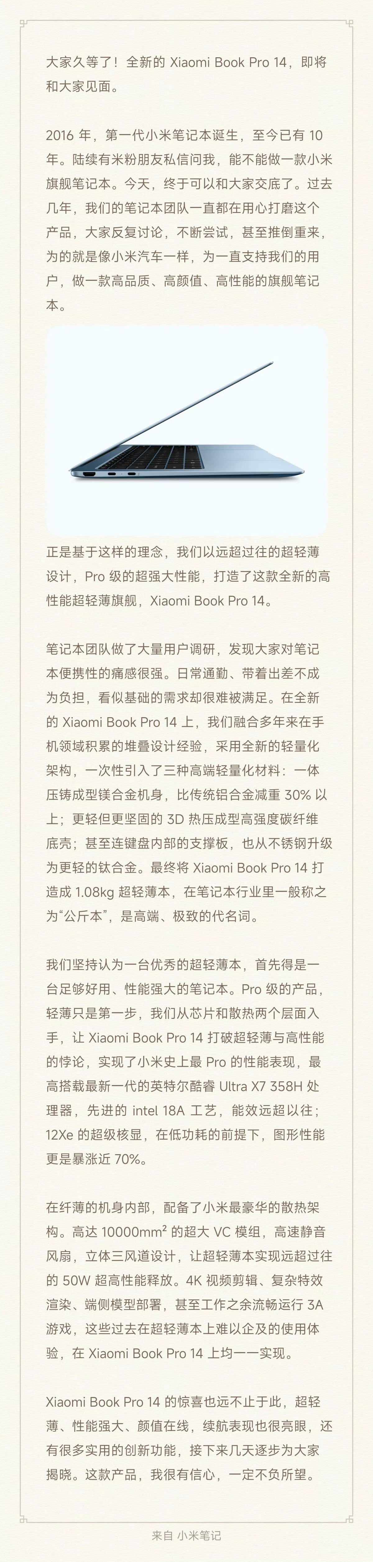 卢伟冰官宣小米笔记本新品即将发布时隔四年,小米笔记本终于带着Pro 14杀回来了。这次,它瞄准了那个老难题——既要轻薄,还得性能强、续航久。整机才1.08kg,塞进包里几乎没感觉。核心配置上了英特尔酷睿Ultra X7,这性能,摆明了是想和ThinkPad X1 Carbon、戴尔XPS这些标杆碰一碰。这次用料更是没得挑,镁合金机身、碳纤维底壳、钛合金键盘,一套不计成本的“超跑级”组合,将轻盈与坚固推到新高度。这不仅是出差神器,更重塑了高端体验——以前总觉得苹果高级,如今小米把顶级材质玩出了新花样。说起来,轻薄本卷了这么多年,能在便携和性能之间找到平衡点并不容易。小米这次交出的,更像是一份给期待“全能体验”用户的答案。实际用起来会不会真如参数所示那样顺手?或许,它至少给出了一个值得关注的新选择。小米品牌时隔四年重新发布笔记本
