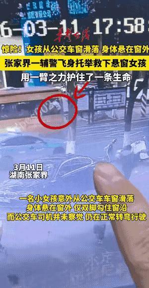 惊险!女孩从公交车窗滑落,身体悬在窗外。 3月11日湖南张家界,一名小女孩意外从车窗滑出,整个人挂在窗外,只剩双脚勾住窗沿,公交车还在正常转弯行驶,司机完全没察觉,看得人心脏都要跳出来了。 就在这千钧一发的时刻,一名辅警猛地冲了上去,飞身托举住女孩,用一臂之力死死托住这条小生命,直到公交车安全停下。 这一幕真的太戳人了,没有丝毫犹豫,没有半点退缩,他用最本能的反应,接住了一个家庭的希望。 很多时候,英雄就在我们身边,不需要惊天动地的壮举,只是在危险来临时,愿意挺身而出的那一秒,就足够照亮整个世界。 也想提醒所有家长,带孩子坐公交一定要看好孩子,车窗边真的太危险了。 你愿意为这位挺身而出的辅警点个赞吗?平时带娃坐车,你会特别注意哪些安全细节?