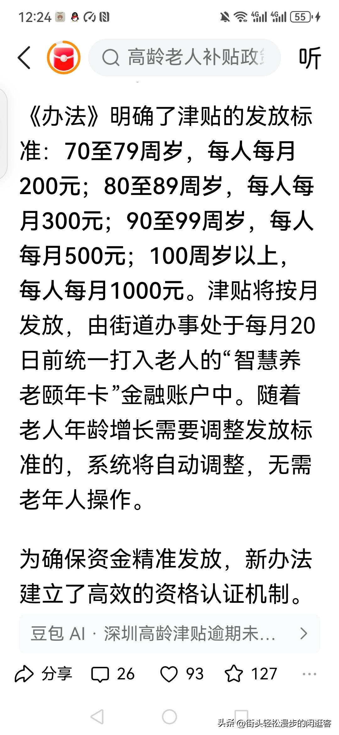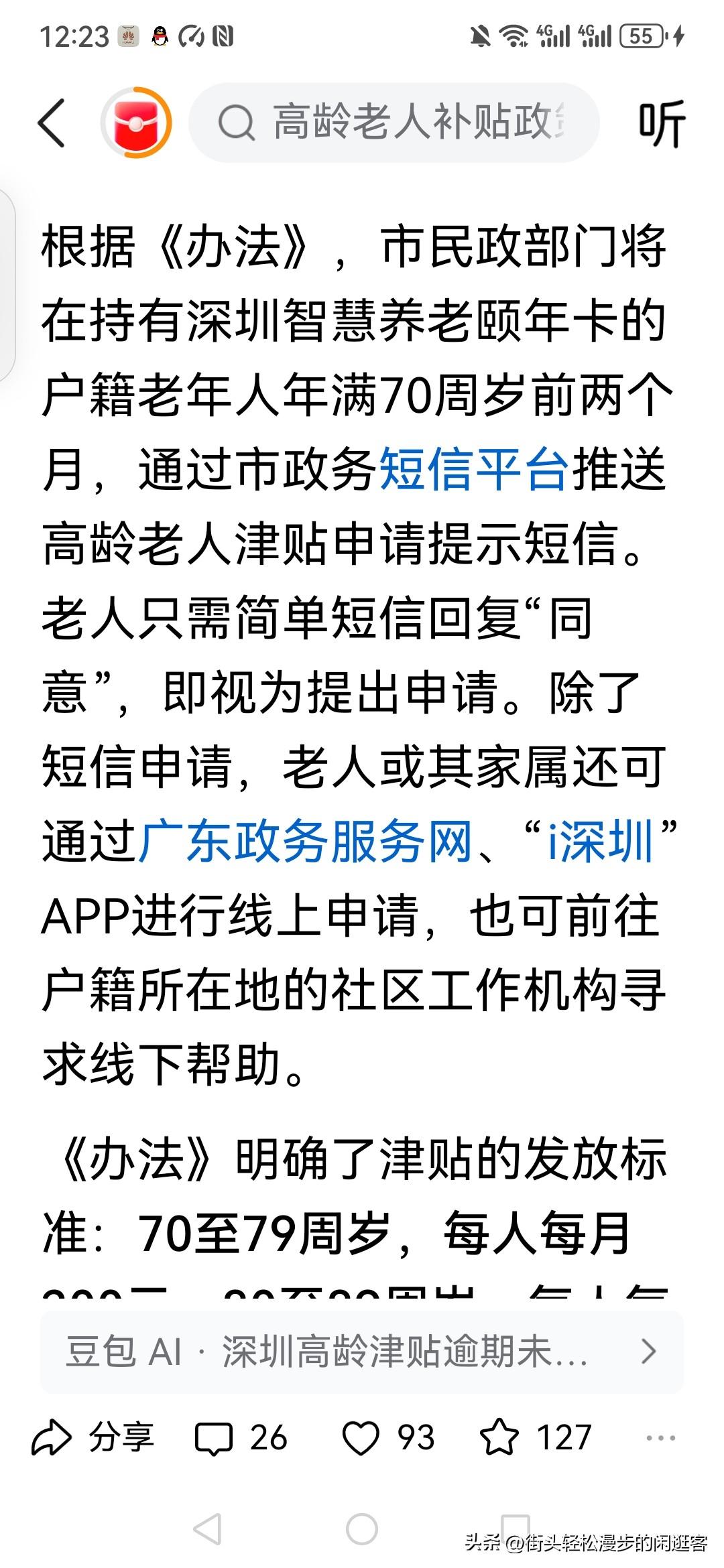 短信回复同意,就可以申领到最高每月1000元的高龄补贴! 深圳市的这个举动太暖心了! 不仅仅在于每月从200到1000元的补贴! 更在于深圳对于高龄老人的便民举措! 高龄老人如果还需要去通过哪怕是手机上繁杂的手续才能申领补贴, 那就不是真正为民服务,而是形式主义! 建议全国各地有条件的地方都学习起来, 提高老年人高龄补贴,不断简化养老金,补贴申领手续, 主动帮扶农村老人开通社保卡功能! 真正为高龄老人养老创造最暖心贴心的环境和保障!