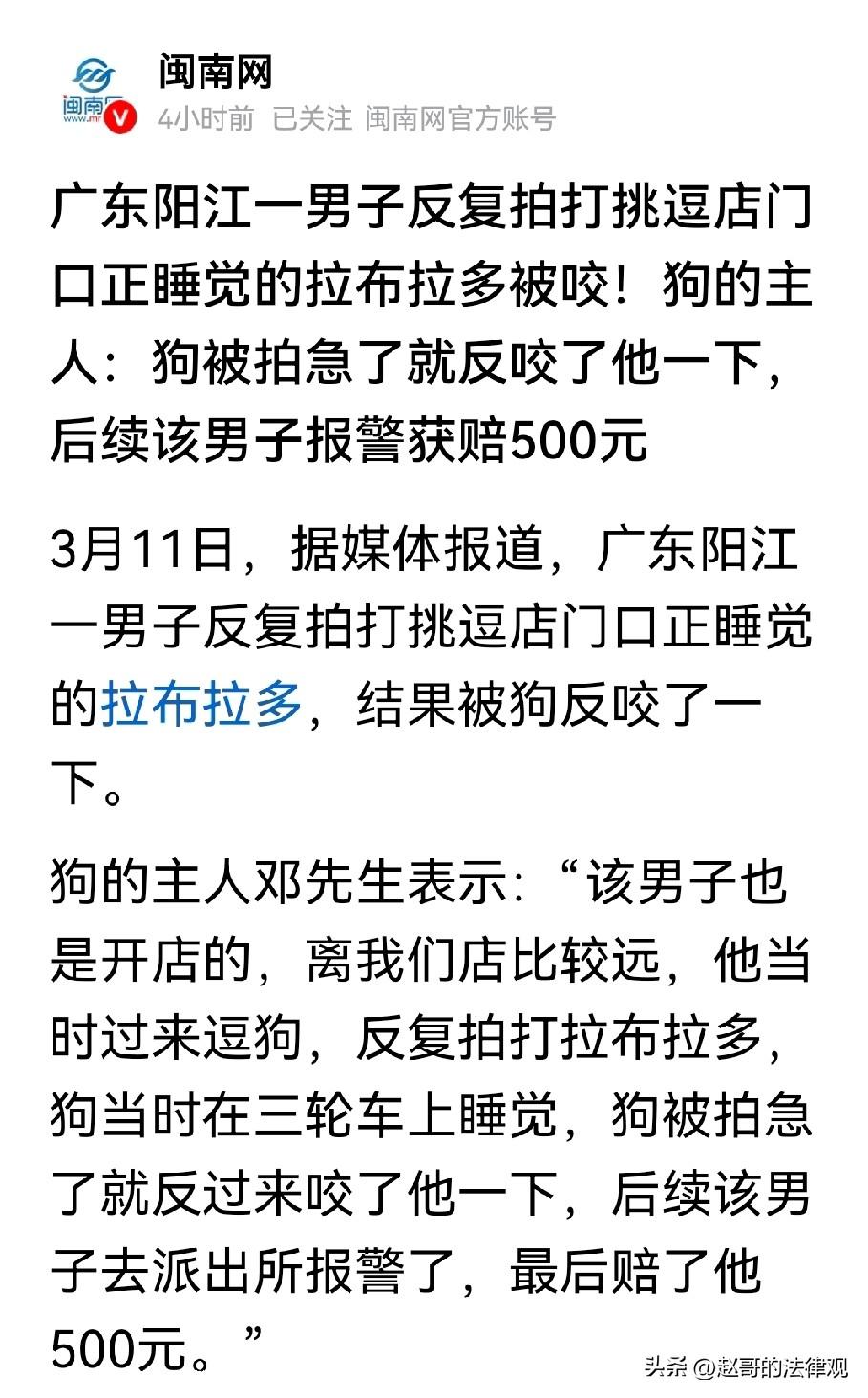 这就是手贱的后果!广东阳江,店老板养了一条拉布拉多犬,它非常温顺,平时就在店门口的三轮车上晒太阳睡觉。一男子路过时,看到狗子睡着了还打呼噜,觉得好玩,就反复拍打、挑逗它,狗子被拍急眼了,回头咬了他一口,男子立马报警,要求赔钱。网友:这不就是吃饱了闲的吗? 那天,阳光暖暖地晒着,一家店门口的三轮车上,一只拉布拉多狗,正舒舒服服地趴着睡觉。 它那圆滚滚的身子,随着呼吸一起一伏,轻声打着呼噜,耳朵时不时动一动,模样别提多惬意了。 可谁能想到,这平静的一幕很快就被打破了。 一场意外就这么毫无预兆地降临,还引出了后续让人议论纷纷的事儿。 一男子,闲得无聊,晃晃悠悠地来到了这家店门口。 他一眼瞅见正在三轮车上睡觉的拉布拉多,狗子很胖,身子圆滚滚的装满了三轮车厢。 主人邓先生,看狗子睡着了,还特意给他身上盖了条毯子。 男子看着狗子睡得正香,不时的轻声打着呼噜,觉特别得好玩。 他一时兴起,伸出手开始反复拍打、挑逗起这只狗来。 一下,两下,三下……那动作轻飘飘的,就像在逗弄一个没生命的玩具似的。 拉布拉多原本正沉浸在美梦里,突然被这没来由的拍打给惊醒了。 它迷迷糊糊地睁开眼睛,一脸懵圈地看着眼前这个陌生的男子,眼神充满疑惑和警惕。 男子压根没察觉到狗的情绪变化,依旧拍打着玩,还时不时做出一些挑逗的动作。 拉布拉多越来越烦躁,它试图躲开男子的手,可三轮车空间就那么大,它根本无处可逃。 它的身体开始紧绷起来,喉咙里也发出低低的呜咽声,像是在警告男子。 可男子却像是没看见似的,继续他的“逗狗”动作。 拉布拉多被他彻底激怒了,它猛地露出犬牙,朝男子的手就是一口! 这一口咬得可不轻,男子疼得“哎哟”一声叫了出来,赶紧把手缩了回去。 他看着自己手上被咬出的伤口,又气又恼。 这狗子太不识好歹了,自己不过是喜欢逗逗它,它居然敢咬人。 狗主人邓先生听到动静,从店里跑了出来。 他看到眼前这一幕,心里也有点着急。 他赶紧查看男子的伤口,一边安慰他,一边解释。 他说这狗平时可温顺了,它就是被你拍急了,才反咬了你,真不是故意的。 男子根本不听这些,自己被狗咬了,那肯定不能白咬啊,必须要讨个说法! 双方就这么僵持着,谁也不肯让步。 男子觉得,邓先生必须赔偿他的损失,被狗咬了可不是闹着玩的,光疫苗就得打好几针。 作为狗主人,邓先生则觉得错在男子,他是因为逗狗才被咬的 “我家狗子这个犬种就是很温顺,它好好的在三轮车上睡觉,又没招谁惹谁。 你一个生人,谁让你手贱,反复挑逗正在睡觉的狗子?” 男子觉得自己理亏,不再和邓先生争辩,一气之下报了警。 民警了解了事情的经过后,对双方调解。 考虑到男子确实是被狗咬伤了,后续要打好几针才能康复,有一定的损失。 但他反复挑逗狗,也存在过错。 经过一番调解,狗主人邓先生赔偿男子500元。 这500元,邓先生觉得拿的就是很冤。 这事儿传出去后,在周围人群引起了不小的议论。 有人说男子太不懂事了,狗在睡觉的时候去挑逗它,这不是自找被咬吗? 也有人说,狗主人也有责任,没把狗看管好,才导致狗咬了人。 但是男子挑逗狗也是事实。 他不逗狗,就不会被咬,那他是不是就不该得到赔偿? 那么这500元的赔偿到底合不合理呢? 民法典第一千二百四十五条规定:饲养的动物造成他人损害的,动物饲养人或者管理人应当承担侵权责任; 但是,能够证明损害是因被侵权人故意或者重大过失造成的,可以不承担或者减轻责任。 本案中,狗主人邓先生作为饲养人,其饲养的拉布拉多犬咬伤了逗狗玩的男子。 邓先生本应承担侵权责任。 但由于是男子故意反复拍打、挑逗正在睡觉的狗,才导致狗被激怒咬人。 男子对损害结果的发生存在故意,所以狗主人邓先生可以减轻责任。 民警调解邓先生赔偿男子500元,就是考虑了男子确实遭受了身体伤害。 需要承担医疗费用等损失,而狗主人又因对方故意挑逗,可减轻责任这两方面因素。 既保障了被侵权人,获得一定赔偿以弥补损失,也体现了对其不当行为的考量, 并没有让狗主人承担全部责任。 你觉得,狗主人该不该拿着500块钱呢? 关注@赵哥的法律观