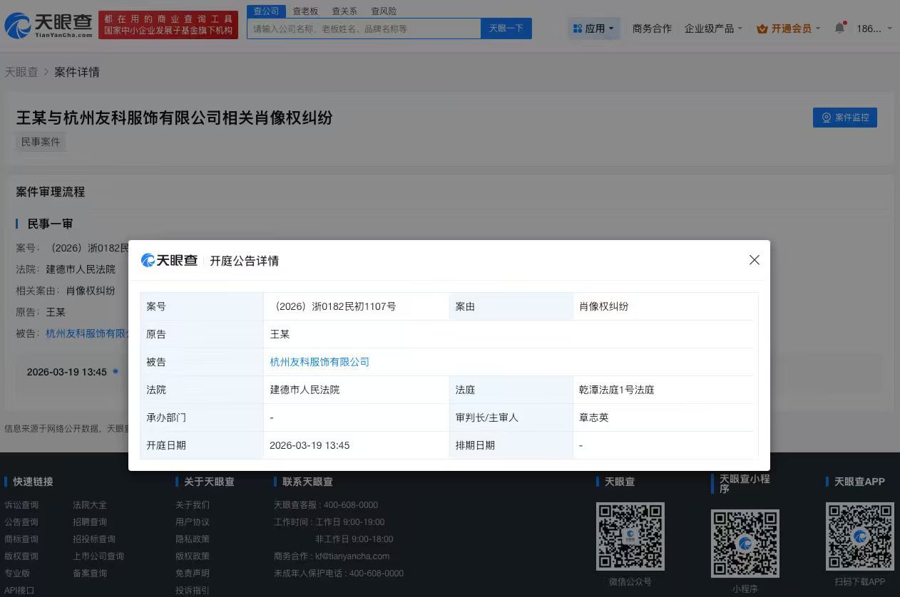 王鹤棣王鹤棣起诉服饰公司侵权王鹤棣肖像维权案件下周开庭天眼查App显示,王鹤棣与杭州友科服饰有限公司肖像权纠纷案新增开庭公告,原告为王鹤棣,该案将于3月19日在建德市人民法院开庭审理。