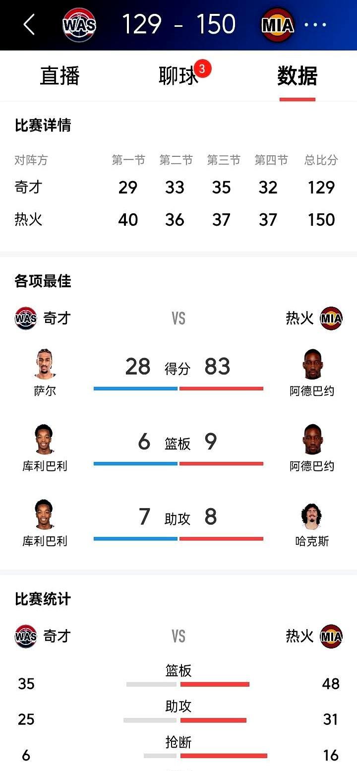 谁能想到,阿德巴约能砍下83分。 3月11日NBA常规赛,热火主场150比129击败奇才。 阿德巴约全场出战42分钟,43投20中,罚球43罚36中。 除了83分,还拿到9篮板3助攻2抢断2封盖,攻防两端拉满。 他此前生涯最高得分才41分,这场直接破了詹姆斯保持的热火队史61分纪录。 83分排在NBA历史单场得分第二,仅次于张伯伦的100分,超过科比的81分。 当时热火伤了希罗等多名主力,基本靠他一个人扛着全队进攻。 你觉得未来十年,有人能打破张伯伦的100分纪录吗?