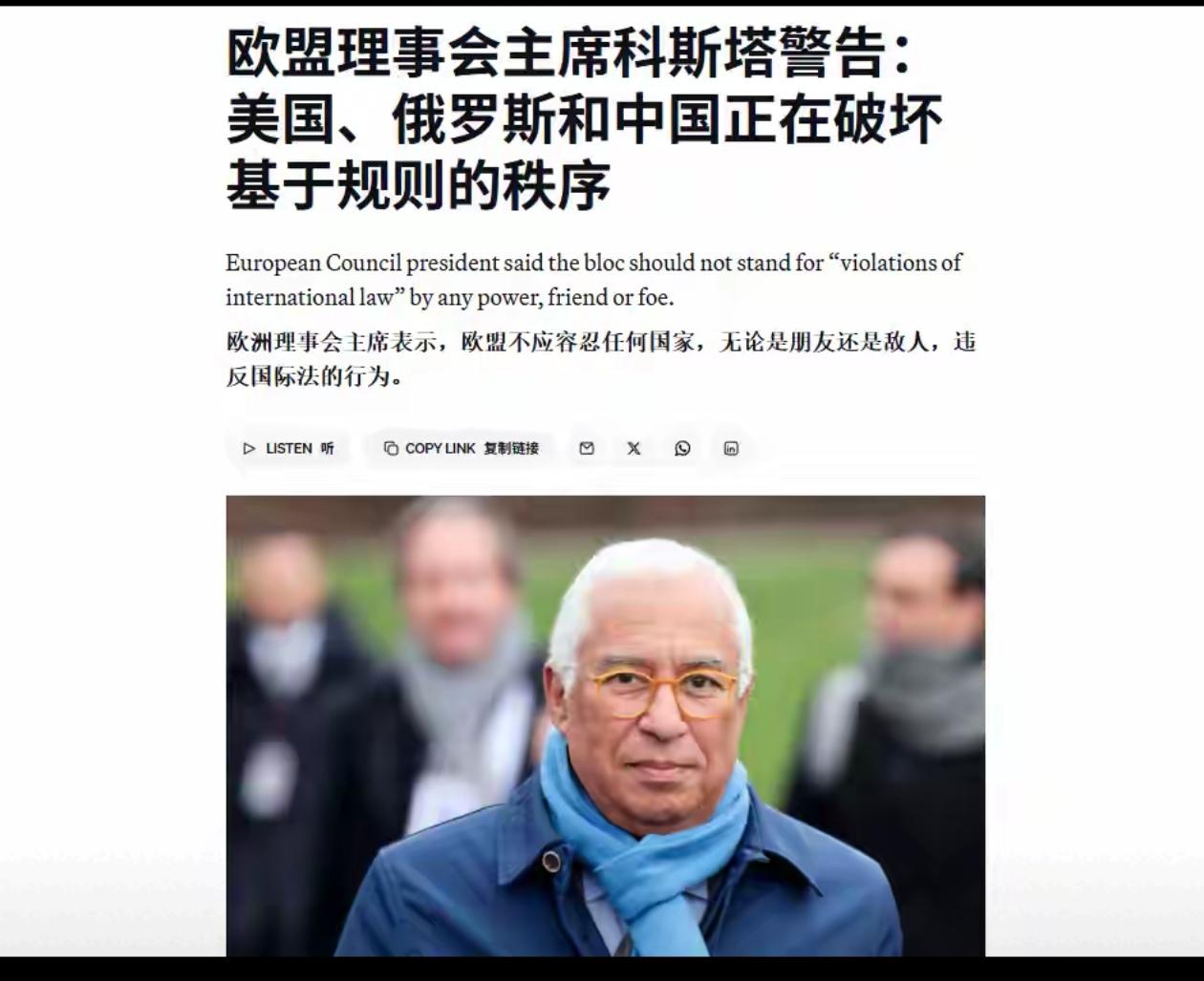 欧盟理事会主席安东尼奥.科斯塔在昨天(3月11日)举行的欧盟外交使团会议上警告称:“国际体系正发生剧烈变革,强权政治卷土重来的世界已经到来。我们认清了这一新现实——在这一现实中,俄罗斯破坏和平,中国扰乱贸易,美国挑战以规则为基础的国际秩序,只有欧盟还在坚守规据。” 欧盟委员会主席冯德莱恩则称:“在当前这个混乱且交易至上的世界中,欧盟应该奉行更现实、以自身利益为导向的外交政策。欧洲再不能做旧秩序的守护者,守护一个已经逝去、不会再回来的世界。” 英国《经济学人》此前评论称,欧盟外长卡拉斯仅凭一己之力与联合国安理会上三常开干,原来科斯塔也秉持同样的观念。科斯塔与冯德莱恩的外交理念截然不同,前者要继续维护所谓的“以规则为基础的国际秩序”,后者则主张面对现实,不再做旧秩序的守护者。不过欧盟外交使团随即发表声明称,冯德莱恩的言论不代表欧盟,仅代表她个人的立场,说明冯德莱恩与卡拉斯的矛盾日益加深。 所谓的“以规则为基础的国际秩序”,美国人从未做出任何解释,也无法做出解释,科斯塔恐怕也说不清楚。纽约时报评论称,这句话已经臭了大街,不仅特朗普政府没人提及,西方国家领导人也很少再讲。因为所谓的“规则”就是美国霸道的随心所欲的规则,所谓的“秩序”就是说一不二的霸权秩序,而广大发展中国家希望遵守的是以联合国宪章为基本准则的国际秩序。