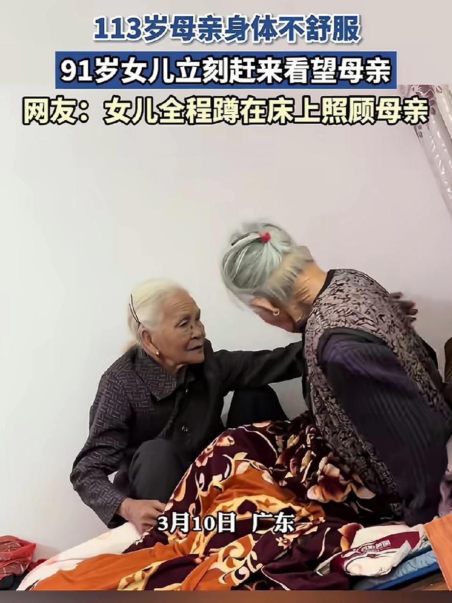 91岁的女儿照顾113岁的母亲,真羡慕这么大年龄还有妈叫,有妈就有家,母女二人虽都是高龄之人,可见穿的衣服盖的被子都很干净,老母亲身体有些不舒服,在女儿细心呵护下也会很快好起来的,祝福这对母女幸福陪伴到永远!