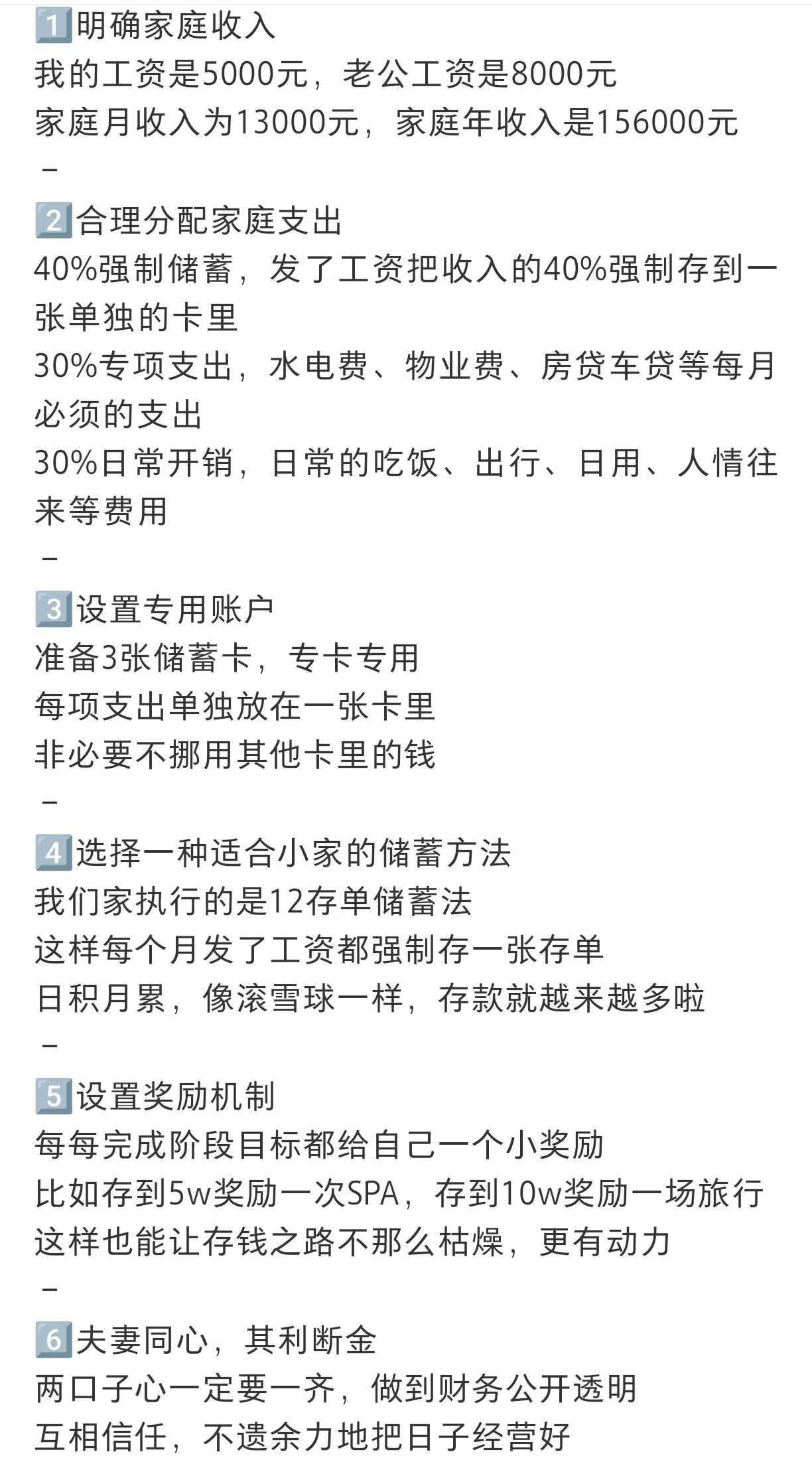 我的工资6500,我媳妇工资10000,一年到头存不下钱,人家夫妻两口子的6步存钱法,着实让人羡慕哇。 存钱,一定是当下家庭抗击风险最有效的手段,没有之一!现在才明白,存钱不是抠门,而是一个家庭对抗风险最踏实、最有效的底气。手里有存款,遇事不慌,生活才有安全感。别提通货膨胀,普通人的存款体量,压根儿不配提这么高大上的词[捂脸][捂脸][捂脸] 你们平时都是怎么存钱的?有没有适合普通家庭的存钱办法?