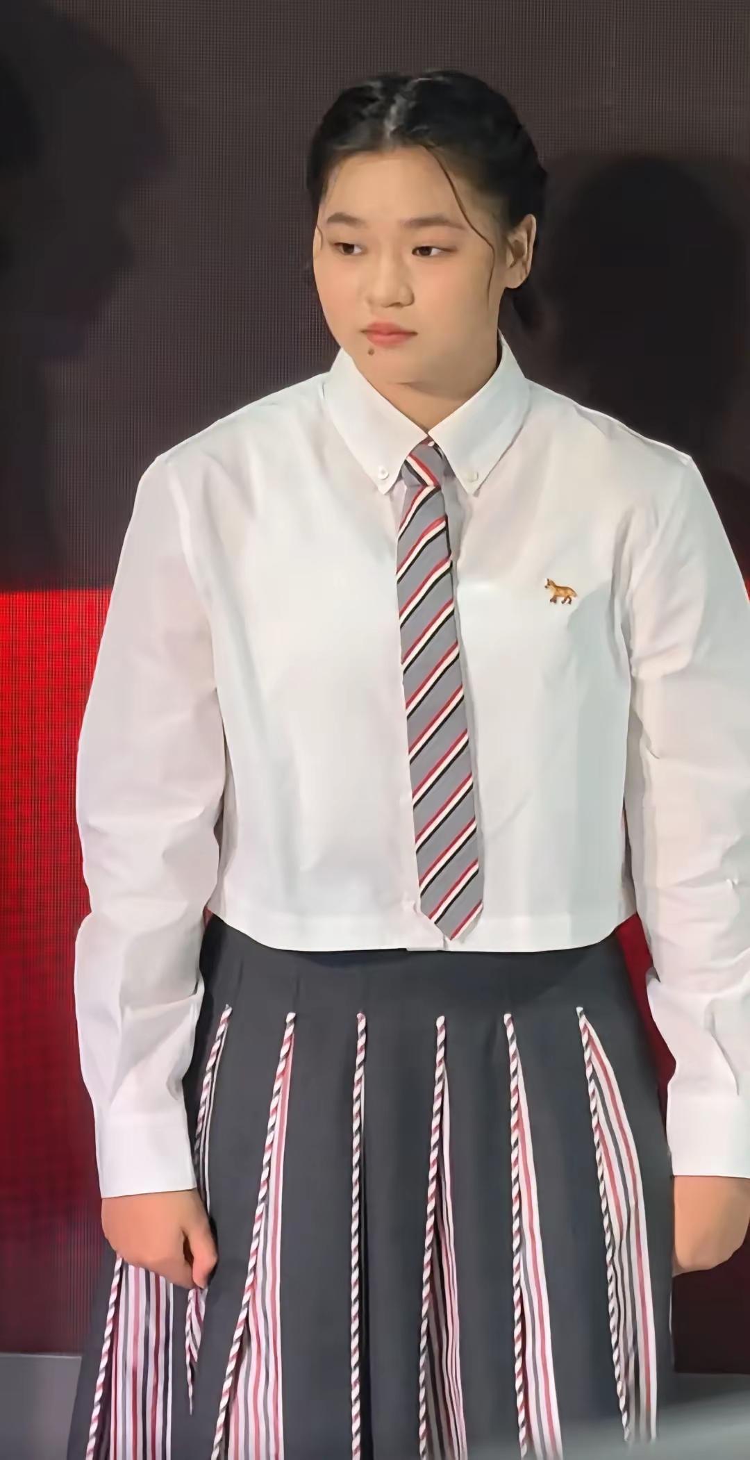 全红婵现在越来越壮实魁梧了! 今天她参加万家乐的活动,白衬衫配着条纹领带,再穿上百褶裙和马丁靴,头发盘得整整齐齐,看起来乖巧又有学生气。 不过对比她以前赛场上的轻盈感,现在整个人真的胖了很多。现在已经19岁了,骨骼也基本定型了,应该是遗传了妈妈的大骨架!全红婵