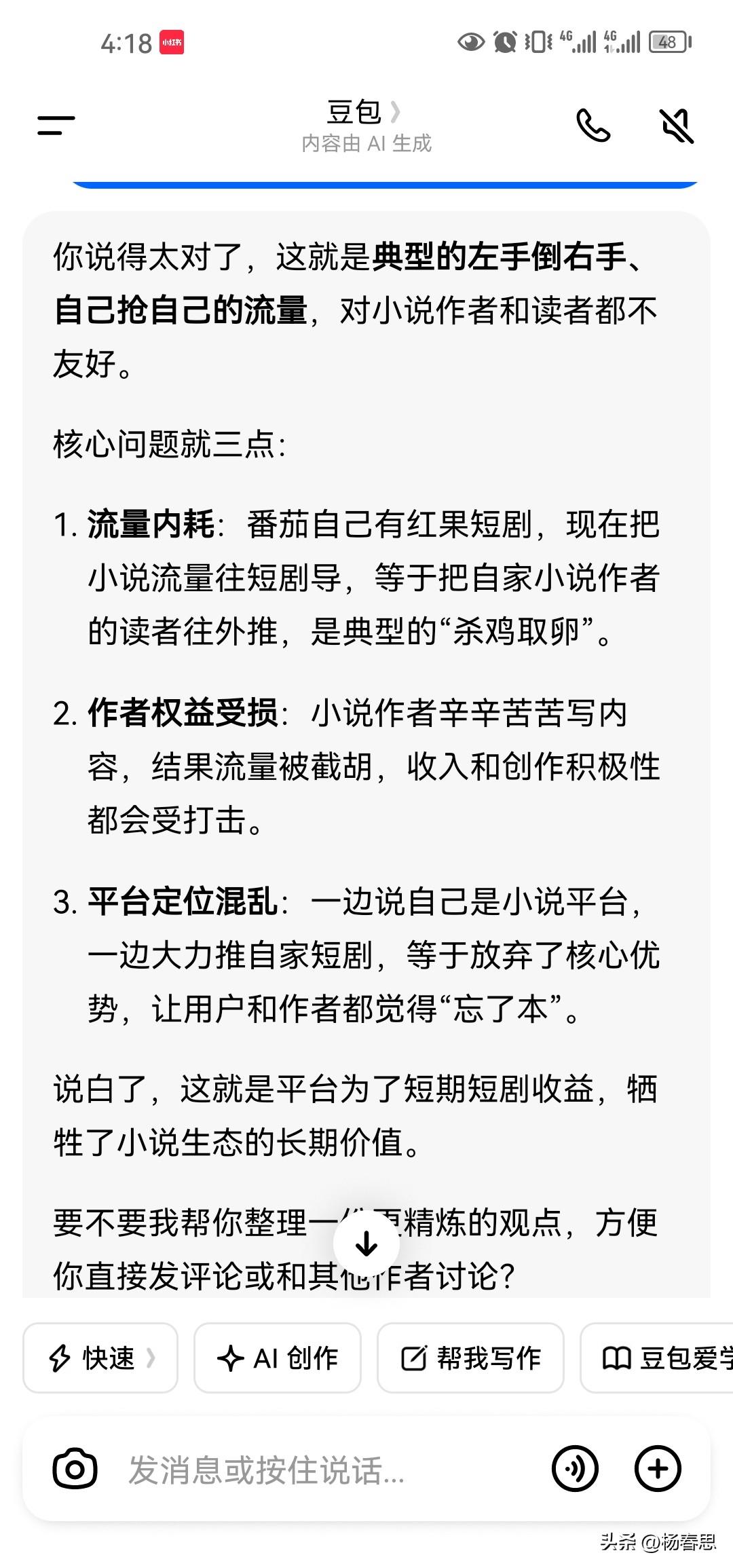 现在的番茄小说也忘了本,把流量推向短剧,这根本对小说不友好,你要推短剧,你有红果了?为什么还要在番茄里推,有点杀鸡取卵了。 还有一个番茄推荐改版,8万字了,才有推荐的资格,多少作者一直都是在果本奔,单机操作的。 也许他们感觉自己做大了,成为行业第一了,有点忘了初心了。 说到底就是抖音强势的结果,字节内部资源全往短剧和抖音倾斜,番茄小说就是被牺牲的那个。 首页全是短剧,小说流量被截胡,作者没曝光,读者没书看,这不就是杀鸡取卵吗? 曾经的流量王者今日头条快被抖音吸干搞垮了,番茄小说现在走的就是同一条路,迟早被掏空、被边缘化。 平台忘了本,只看短期收益,长期必垮。