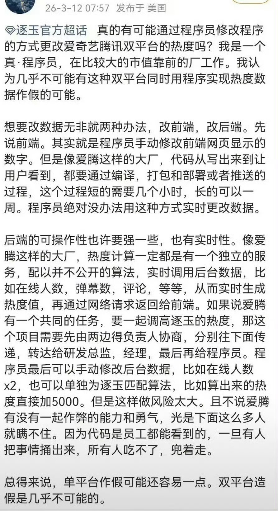 有专业程序员发文分析《逐玉》数据说:单平台作假倒是有可能,双平台造假几乎不可能。