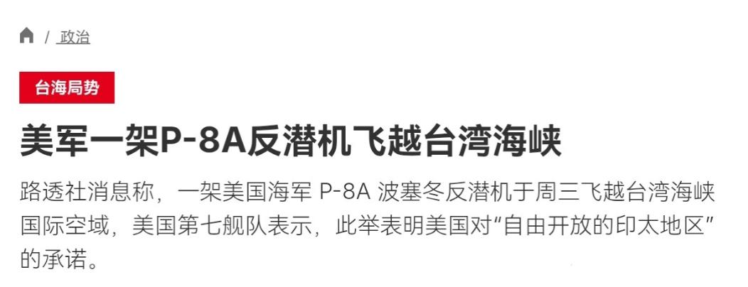 真嚣张!在伊朗脱不开身,美国竟然在台湾又对我们进行挑衅!3月12日,根据法新社报道,法媒称,一架美国海军 P-8A 波塞冬反潜机于周三飞越台湾海峡,美国第七舰队对此表示称,美国按照国际法在台湾海峡行动,美国维护所有国家的航行权和自由。很显然,美国战机在台海飞行,明显是故意为之。 现在局势已经在明白不过了,美国在中东脱不开身,甚至美国正在从韩国抽调军事资产移往中东,美国此举意欲为何呢? 美国和以色列从2月28号就开始大规模空袭伊朗,打了这么久,不仅没占到便宜,反而越陷越深。伊朗方面也没示弱,不仅动用集束弹药反击以色列,还警告美国,要准备好迎接每桶200美元的油价,甚至放话说要封锁霍尔木兹海峡——要知道,全球五分之一的海运石油都要从这条海峡过,一旦封锁,整个国际能源市场都会乱套。 更能说明美国在中东分身乏术的是,就在3月10号左右,美国已经开始把部署在韩国的部分 “萨德” 反导系统,还有先进的 “爱国者” 拦截导弹,都抽调往中东地区。据美国媒体报道,美军在打击伊朗的头两天,就消耗了价值56亿美元的弹药,现在拦截弹库存已经很紧张,短期内根本补不上来。 而且伊朗还摧毁了美军在海湾地区的多部 “萨德” 系统雷达,美国只能从其他地方调装备过去应急,可见它在中东的压力有多大。 可就是在这种自身都顾不过来的情况下,美国还非要派战机来台湾海峡挑衅,这背后的心思其实一点都不复杂,全是为了它自己的利益,没有任何正义可言。 首先,美国就是想牵制我们中国。它知道,自己在中东陷得越深,投入的兵力和资源越多,就越没精力顾及亚太地区,它怕我们趁着这个机会,推进台湾回归,实现国家统一,所以就故意派战机来台海刷存在感,说白了就是警告我们,不让我们有任何动作,想把我们牵制住。 其次,美国也是想给自己的盟友打气。这些年,美国一直在亚太地区拉拢日本、韩国,还有台湾当局,想让这些盟友跟着它走,帮它遏制中国,可现在美国在中东自顾不暇,还从韩国抽调军事资产,盟友们难免会心里打鼓,怀疑美国是不是已经没能力保护他们了。 所以美国派战机飞越台海,就是想向这些盟友证明,就算它在中东很忙,也依然有能力在亚太地区发力,依然能 “罩着” 他们,稳住自己在亚太的影响力。 还有一点,美国就是想掩盖自己的实力短板,现在的美国,看似强大,其实已经力不从心了,乌克兰战场、中东战场,到处都要花钱、派兵,军费和战备资源都面临超负荷压力。 它派战机来台海挑衅,就是想装出一副 “我还很强大,能同时应对多个战场” 的样子,欺骗国际社会,也欺骗自己国内的民众,转移国内的矛盾和注意力。 很多人可能会问,美国说的维护航行自由,到底是怎么回事?其实这就是个彻头彻尾的借口。 台湾是中国的一部分,这是国际社会公认的事实,联合国第2758号决议早就明确了这一点,美国自己在中美三个联合公报里,也承认台湾是中国的一部分。 台湾海峡本来就是我们中国的内政范围,我们一直都允许各国合法的船只、飞机正常通过,根本不需要美国来 “维护”。美国派军用反潜机飞越,根本不是为了航行自由,就是故意侵犯我们的主权,挑衅我们的底线。 面对美国的挑衅,我们也绝不会坐视不管。3月12号当天,解放军东部战区就已经组织战机,对这架美国P-8A反潜机进行了跟监警戒,依法依规处置,这就是在明确告诉美国,我们有能力捍卫自己的国家主权和领土完整,不会让它肆意妄为。 其实美国这么做,根本就是搬起石头砸自己的脚,它在中东已经焦头烂额,消耗巨大,现在又分心来台海挑衅,只会让自己的压力更大,顾此失彼,而且它越是挑衅,就越能让我们全国人民团结起来,越能坚定我们统一国家的决心。 台湾是中国不可分割的一部分,这是铁打的事实,不管美国怎么挑衅,不管它耍什么花样,都改变不了这个事实,也动摇不了我们捍卫国家主权的决心。 美国现在的所作所为,只能让全世界看到它的霸权主义本质,看到它的力不从心。等到它在中东彻底脱不开身,迟早会明白,挑衅中国,从来都没有好下场。