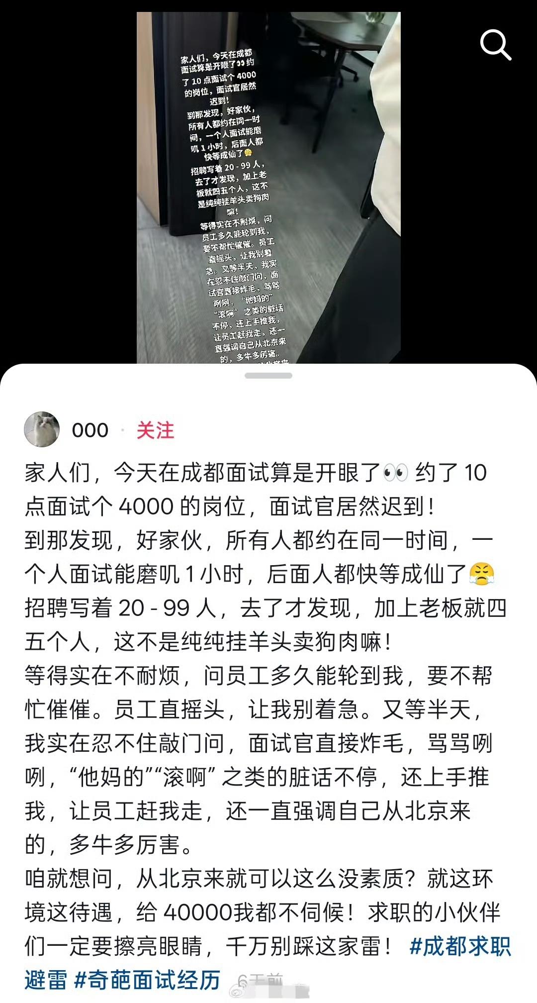 据网友,去一家几个人的小公司面试个4000块的工作,面试官迟到不说,还把所有人约到同一时间来面试,一个人面一小时,其他人干等着…… 实在等不了去问了下,还被面试官骂滚![抠鼻] 职场人面试 求职者求职 大龄员工面试
