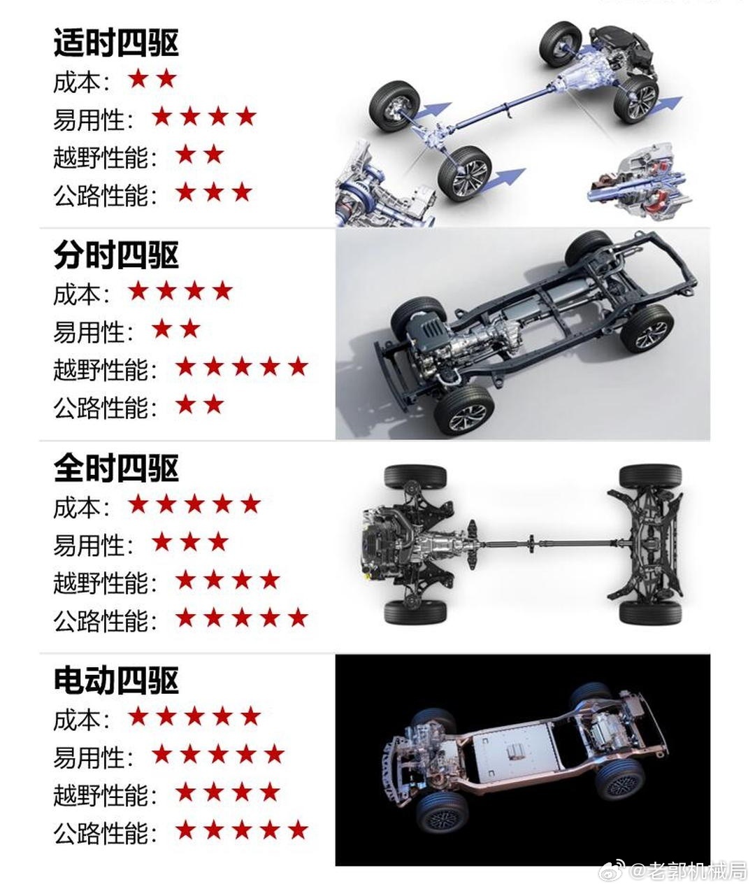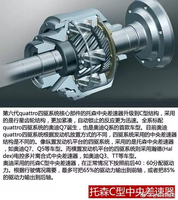 万万没想到,奥迪的四驱居然把全世界都给“忽悠”了!很多人一谈到奥迪的quattro,就会想到什么四驱界里的王者,其实现在国内在售的奥迪,早就不是当年的样子了。咱们大部分家用车的差速器,就像“没脾气的老好人”——开放式差速器,优点是结构简单、成本低,就像普通自行车的传动,省事又便宜;但缺点也很明显,脱困能力差,只要一个车轮打滑,动力就全被“浪费”在打滑车轮上,车子就像陷在泥里的老牛,怎么动都没用。所以四驱车,基本都会配“给力帮手”——限滑差速器。四驱分3种,听我慢慢说:第一种,分时四驱,堪称“硬派越野的灵魂”。它就像手动挡汽车,得自己手动切换两驱和四驱模式,没有中央差速器这个“调节员”。切到四驱后,前后轴就像被焊死一样硬连接,前后轮的转速强制同步,动力均匀分给四个车轮,脱困能力直接拉满,就像四个壮汉一起发力,再滑的路也能闯过去。但缺点也明显,硬连接就像两个绑在一起的人跑步,转弯时会“较劲”,所以四驱模式不能在铺装路面开,否则既伤车又影响操控。不过入门款分时四驱也会“偷工减料”,没有差速锁,改用电子限滑——车轮打滑时,系统自动给打滑车轮“踩刹车”,把动力转给不打滑的车轮,说白了就是为了省成本,BJ40就是典型例子;而坦克300、吉普牧马人这些硬派越野,才是带差速锁的正宗分时四驱。第二种,全时四驱,核心是中央差速器,就像“智能分配员”,能实时把动力按比例分给前后桥,常用的有电控多片离合、托森等类型。初代奥迪Q7、C6版的A6,用的就是托森C型quattro,那才是真·全时四驱。入门级全时四驱就简单多了,只有一个中央差速器,前后桥还是开放式差速器,左右车轮没有限滑功能,全靠电子限滑凑数,比如奥迪早期的A4L 45 TFSI quattro、Q3 45 TFSI quattro;而奔驰大G、兰德酷路泽这种高端越野,中央和前后桥都带差速锁,堪称“越野王者”,价格自然也不便宜。全时四驱操控性拉满,赛道越野都合适,但结构复杂、成本高。第三种,适时四驱,堪称“城市SUV专属”。它本质还是前驱,就像给前驱车加了个“小尾巴”——简单的离合器和电控装置,最多只能给后轮分配30%动力,前后桥也没有限滑功能,成本低、价格亲民,但脱困能力拉胯,大部分城市SUV都用它。当然也有例外,更先进的适时四驱(俗称智能四驱),接近全时四驱水平,能灵活分配动力,最高可达前后50:50,前后桥还有限滑差速器或电子限滑,比如奥迪Q5L、大众途昂、宝马X5、奥迪A6L。现在国内在售的奥迪(进口除外),基本都是这种先进的适时四驱,性能比普通适时四驱确实强,但和当年带托森差速器的全时四驱相比,早就“同性不同名”了!文 张国成