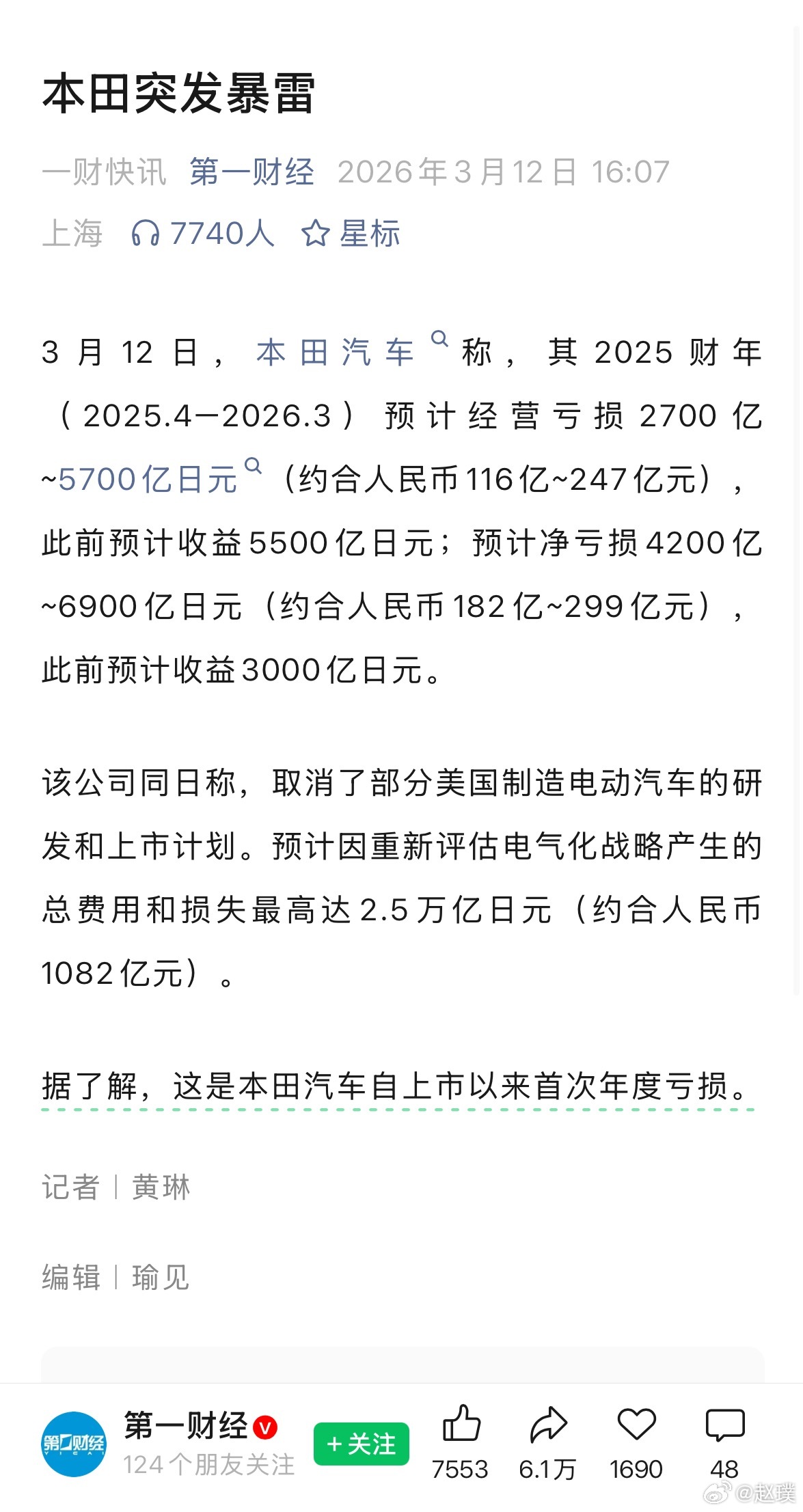 本田突发暴雷本田汽车2025财年将出现巨额亏损,其中,预计经营亏损2700亿—5700亿日元;预计净亏损4200亿—6900亿日元。这是本田汽车自上市以来首次出现年度亏损。