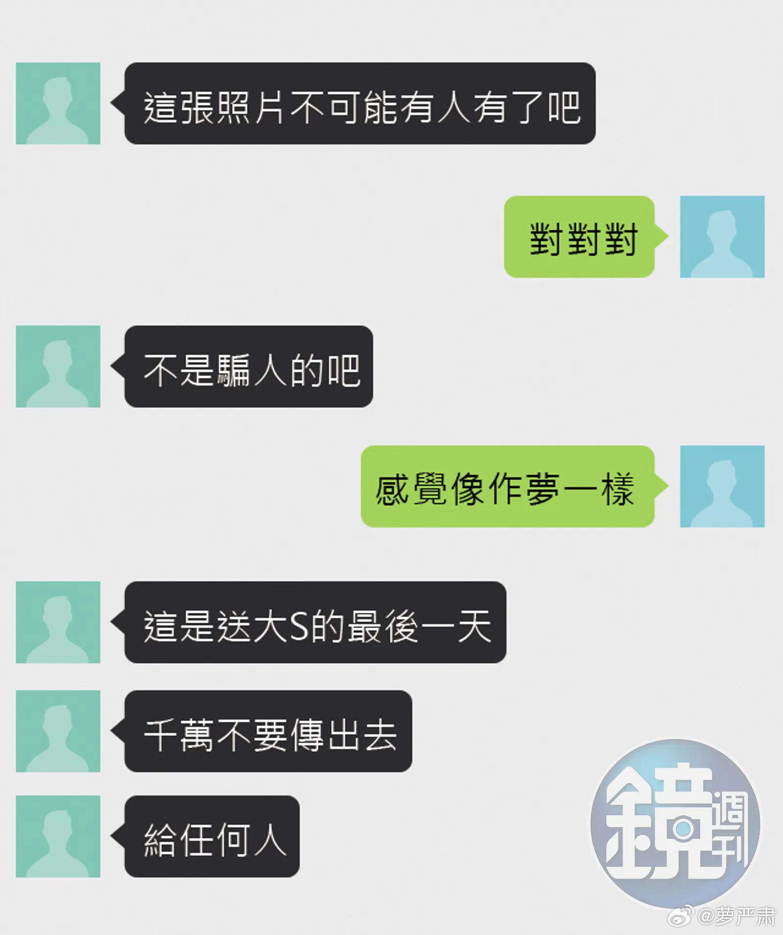 小S老公许雅钧被爆私联大S粉丝,并有聊天截图流传,许雅钧把大S出殡照片发给女粉丝证明自己身份。(图1~图2)