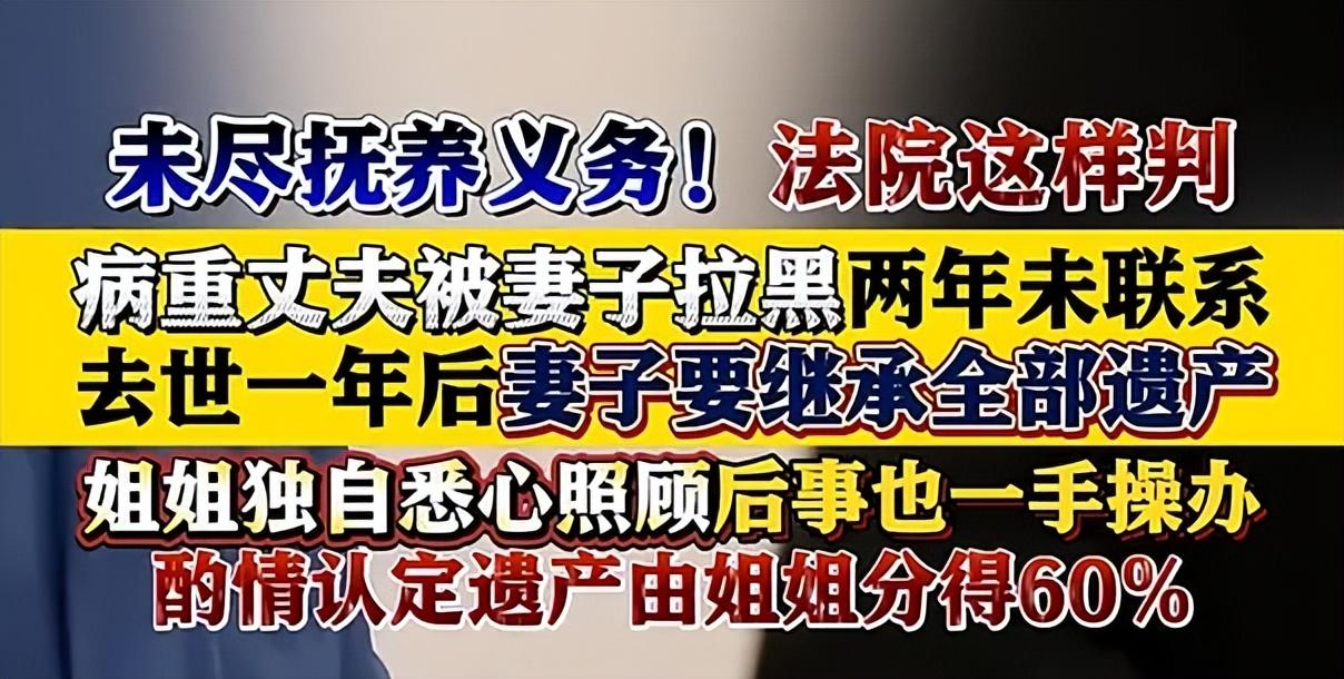 “公平吗?”北京,男子新婚不久,查出重症,妻子竟跟他分居,甚至吵架后把他拉黑,姐姐知道后,上门悉心照料,两年后男子去世,姐姐为其料理后事,没想到一年后妻子跳出来要瓜分遗产,甚至不惜对簿公堂。最后法院居然判的是妻子可以分遗产! 走到法院判决这一步时,人已经不在了。 那套房子和那辆车还在,银行卡里的数字也还在,能替他开口的人只剩姐姐和妻子。 妻子出现得很晚。 她不是在病床边出现,也不是在抢救室门口出现,而是在去世一年后才找到姐姐,开口谈的内容直指遗产。 姐姐听完当场拒绝。 她把过去两年多的日子摊在桌面上,弟弟从确诊到反复住院,家里杂乱、药物堆叠、身体虚弱,身边没有配偶照应,她只能来回奔波,带着病历排队挂号,连夜送医,买药具、做饭、收拾屋子,还要筹钱。 钱从存款里掏,掏空了再去借。 时间从自己的工作和家庭里挤,挤到最后只剩疲惫。 弟弟走的那天,姐姐在场。 后面的火化、安葬、手续办理、灵堂布置,也都是姐姐一个人对接。 妻子那段时间没有露面。 这场争执之所以激烈,并不只是房子值多少钱,更是每个人在关键时刻做过什么。 把时间往前拨,会看到两个人刚结婚不久。 新房还带着喜气,生活计划刚刚开始,重症诊断突然落下,后续治疗意味着漫长的花费和照护。 妻子很快搬离。 她和丈夫之间有过争吵,争吵后把联系方式全部拉黑,之后持续两年没有探视,也没有参与治疗安排。 婚姻关系没有解除,生活却已经断开。 姐姐得知消息后接手照护。 她不是专业护工,做的是最琐碎也最耗人的部分,饮食起居、清洁整理、陪同检查、急症送医,很多事一天都不能断。 她也不是监护人,却在现实里承担起照料者的角色。 等到弟弟去世,姐姐以为事情会慢慢平息。 没想到一年后,妻子回来要求继承全部遗产,双方谈不拢,只能走到法院。 案件审理时,法官要看的不是情绪高低,而是事实和法律条文能否对得上。 配偶在法定继承里属于第一顺序继承人。 只要婚姻关系仍然存在,原则上就有继承资格。 这也是很多人理解上的落差来源。 不少人把继承当成奖惩,觉得谁尽责谁就该拿走全部。 法律更像兜底的分配规则,先按身份排队,再看是否存在需要调整份额的情形。 在这起案件里,法院把重点放在两条线上。 一条线是妻子有无扶养能力,有无扶养条件,是否长期不履行夫妻间扶养义务。 另一条线是姐姐能否被认定为对被继承人扶养较多的人,从而在法定继承格局里获得适当份额。 夫妻之间的扶养义务不只意味着给钱。 它也包含探视照料、协助治疗、必要的精神支持和日常陪护。 法院查明妻子长期分居失联,未参与照护与费用承担。 这种情形下,遗产分配可以对其少分。 少分并不等于完全剥夺。 要走到完全剥夺,通常需要更明确、更严重的法定情形,门槛很高。 姐姐虽然不是第一顺序继承人,却在两年多里持续承担主要照护和丧葬安排,客观上填补了配偶缺位的空档。 法律对此也给出解释。 对被继承人扶养较多的非继承人或其他适格人员,可以分得适当遗产。 在综合双方行为后,法院最终给出四六分配。 妻子拿到40%。 姐姐拿到60%。 判决出来后,很多人不服气。 不服气的点不止在数字上,还在一句常见的疑问上,既然两年不管不问,为何还能继承。 理解这类案件,有几个细节容易被忽视。 第一,日常生活里分居不等同于离婚。 第二,不履行扶养义务会影响份额,未必直接清零。 第三,照护者最好留下证据链。 垫付医疗费的转账记录、病历上签字、护理器具购买凭证、急救陪同记录、殡葬支出清单、借款凭据,都是将付出转化为可被采信事实的材料。 很多家庭纠纷不是输在道理上,而是输在材料散、证据断。 这起案子还有一个更现实的外延。 遗嘱。 假如病重期间能立下一份合法有效的遗嘱,明确遗产归属,争议空间会小很多。 遗嘱不是老年人的专利。 重大疾病、意外风险、婚姻变化,都可能把普通人推到需要提前安排的处境。 写遗嘱也不是随便写几行字就行。 日期、签名、处分范围、财产清单、见证规则、是否涉及夫妻共同财产的边界,都关系到效力。 想减少无效风险,可以考虑符合法律要件的自书遗嘱,也可以选择公证遗嘱或在专业机构指导下完成合规文本。