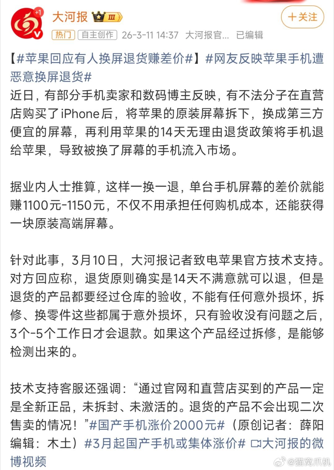 苹果这几天更新了自己的保修政策:线下直营店当场退款彻底取消,所有退货必须返厂全检;线上检测从1-2天延长到3-7天,拆修设备直接拒退并风控账号。