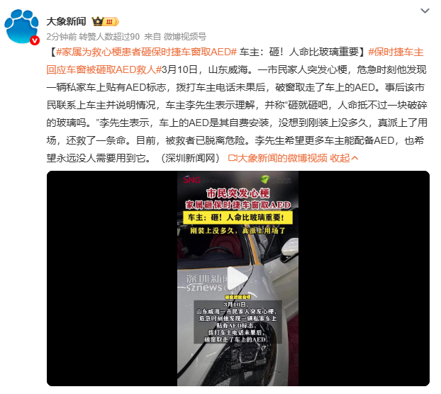 保时捷车主回应车窗被砸取AED救人李先生车窗被砸却笑称“开心”,因AED终于救到人。他自费安装设备,源于父母曾被邻居急救的经历。如今这份善意传递出去——车窗可修,生命无价,这才是最动人的“破窗效应”。