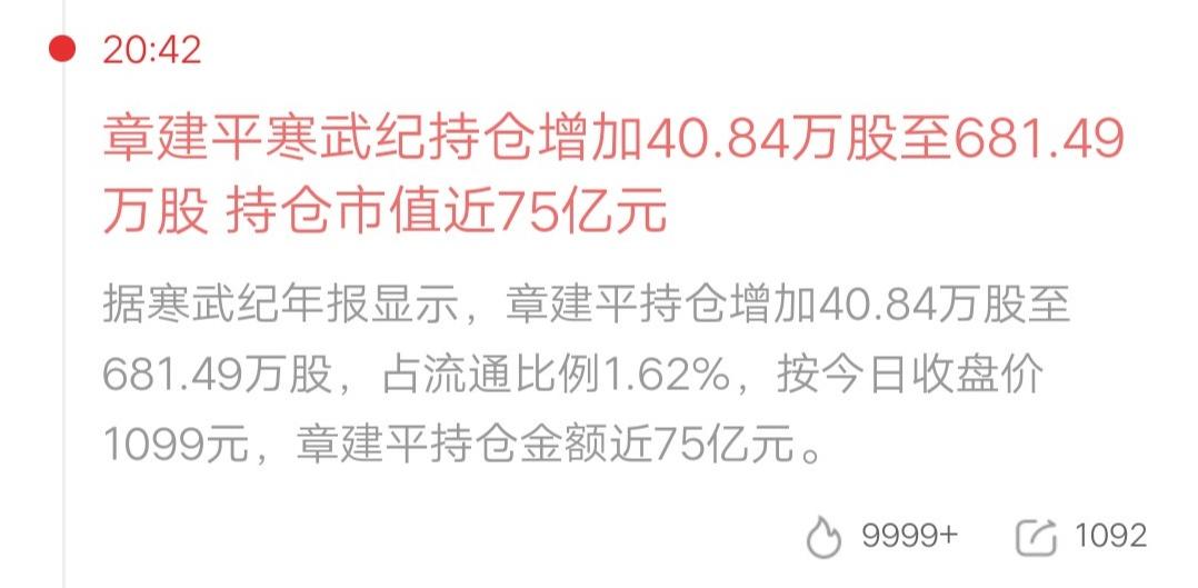 A股最富有的游资诞生了,你们猜是谁?寒武纪公布了2025年报,营收64.97亿,同比增长453.21%;净利润20.59亿,上年同期亏4.52亿。业绩炸裂呀,简直屌爆了。 同时十大流通股东也更新了,章建平持股数681.49万股,按照最新价计算市值75亿元。章建平在2024年报披露时,持股数为533.88万股。所以章建平加仓了,还是价值投资赚钱稳呀。 要知道寒武纪里的钱,只是章盟主的一部分,全部资产肯定更多。说他是最富有的游资,应该不过分吧。 太羡慕了,各位老师们,还得继续加油呀!