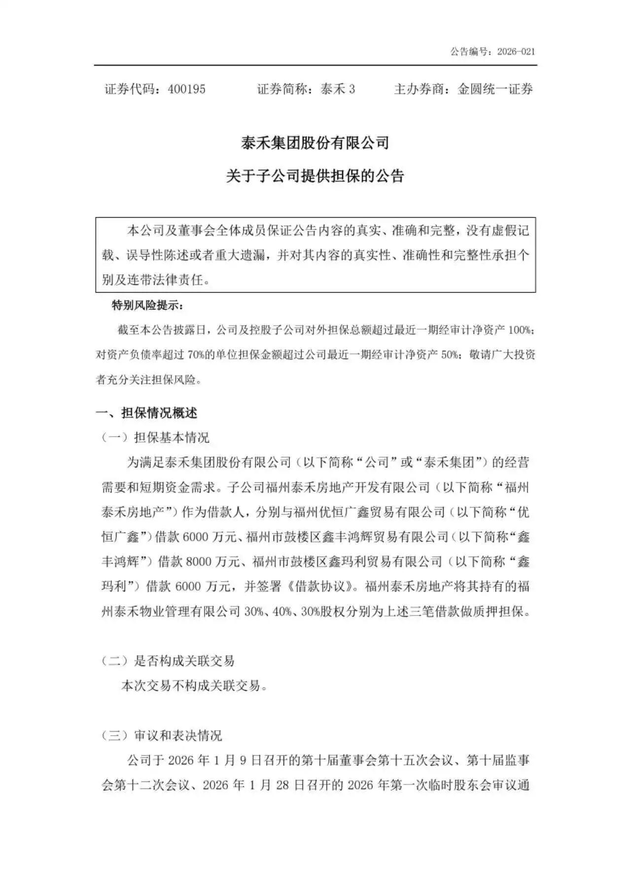 无奈?!泰禾集团为2亿借款质押旗下物业公司![惊呆] 3月11日,泰禾集团发布公告称,为满足公司经营需要,子公司福州泰禾房地产通过质押旗下物业公司100%股权的方式,向三家贸易公司合计借款2亿元。 据了解,截至今年1月31日,泰禾集团及其并表公司逾期的有息总负债本金余额为715.78亿。公司及实控人多次被列入失信被执行人名单。在泰禾超700亿的逾期债务面前,2亿或许只是杯水车薪。 而此次被质押的福州泰禾物业,是泰禾手中为数不多仍具稳定现金流价值的优质资产,显然是企业耗尽正规融资渠道后的无奈之举。