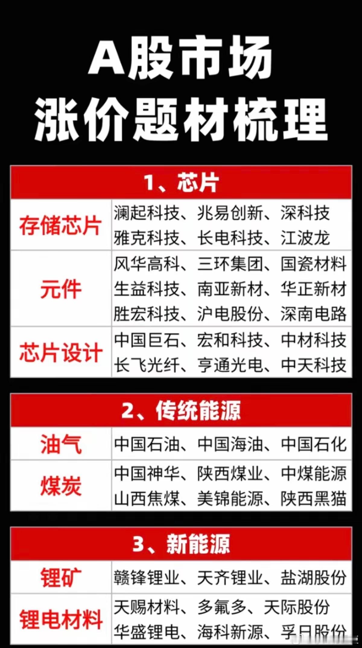 A股市场:涨价题材梳理!1.芯片(存储芯片、元件、芯片设计)2.传统能源(油气、