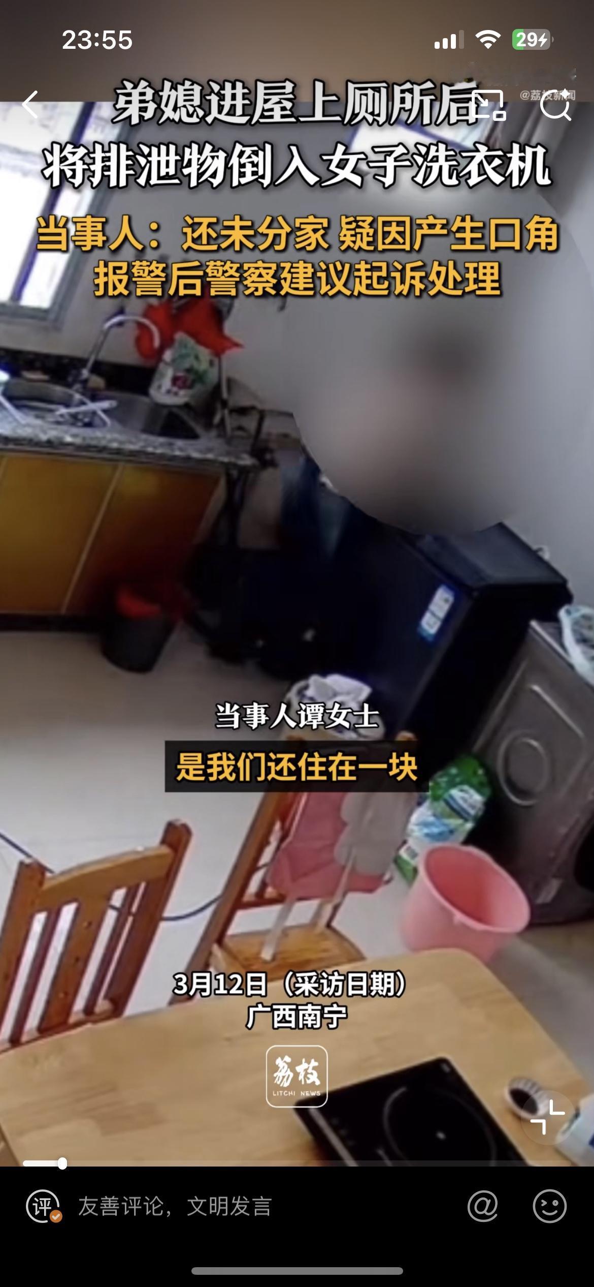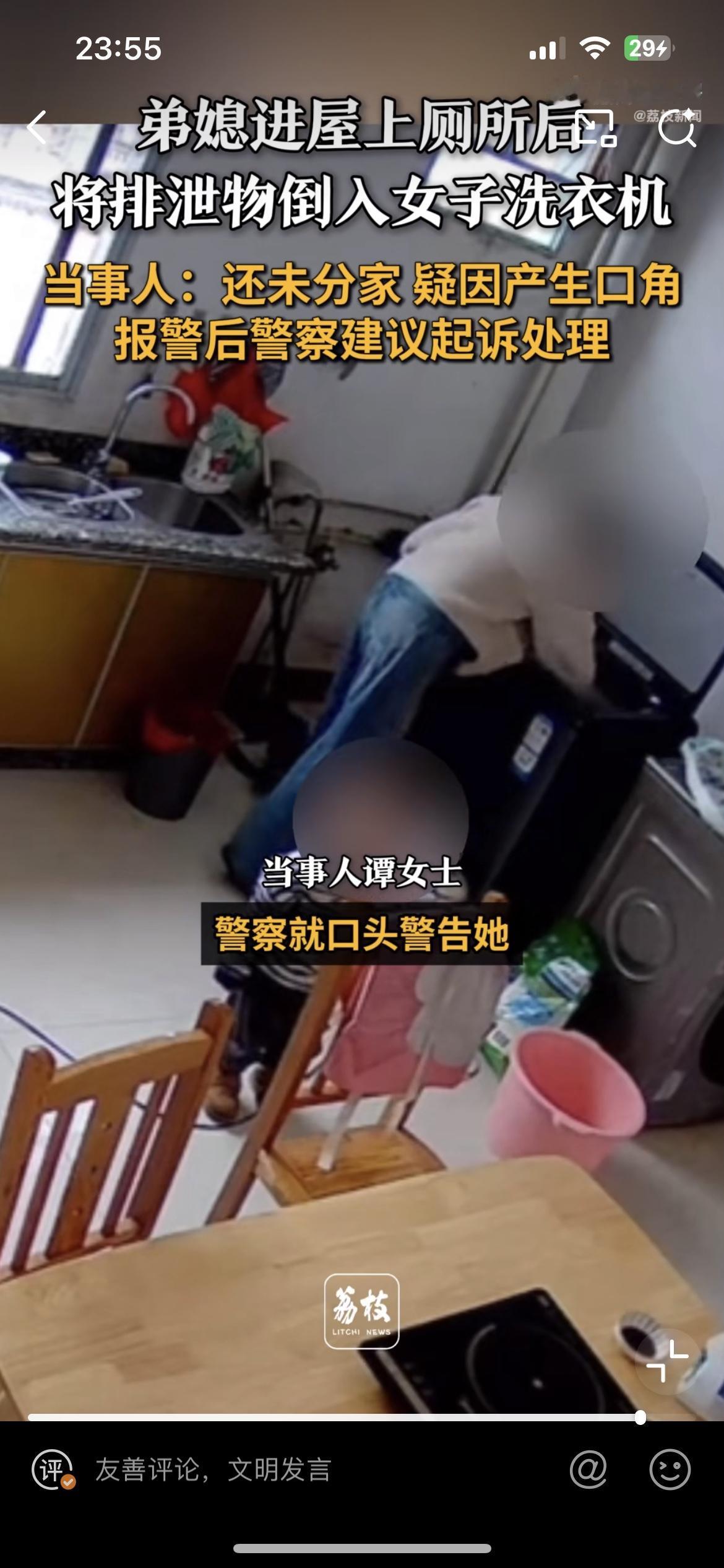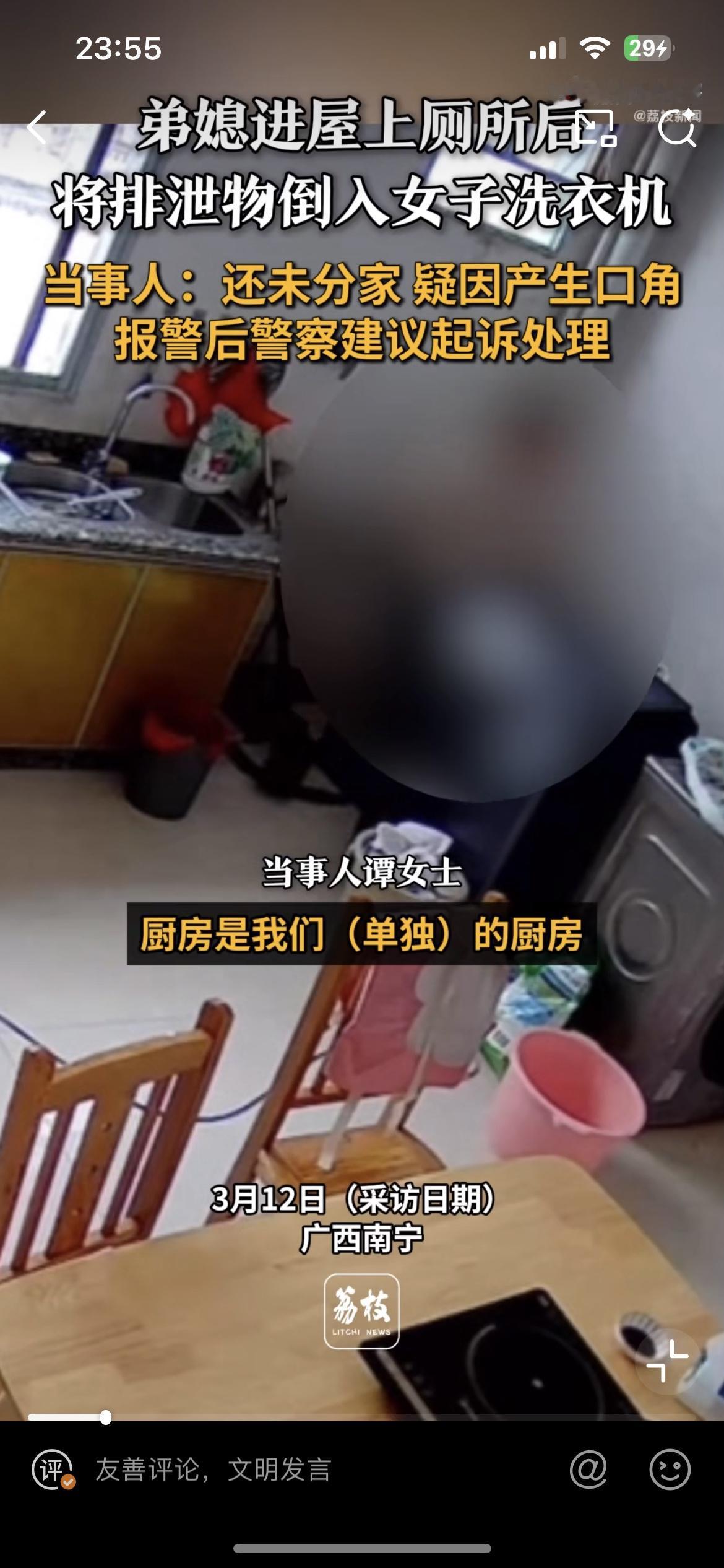 竟然有这么恶心的人,弟媳往嫂子洗衣机里面倒尿,就为了报复她。广西南宁的谭女士爆料,家里的洗衣机洗出来的衣服总有一股尿骚味,但总是找不到原因。后来在厨房装了监控,视频里面的恶心一幕简直让人惊掉下巴。只见弟弟的老婆在厨房拉尿,尿液全部倒到洗衣机里面,这台洗衣机正是她日常洗衣服用的。谭女士拿着监控视频去找弟媳妇对质,弟媳妇则称之前他们发生过矛盾。婆媳矛盾是天下第一难解的,妯娌矛盾可以排第二。