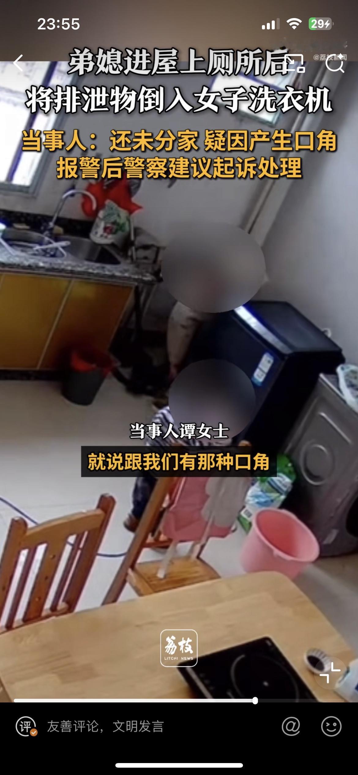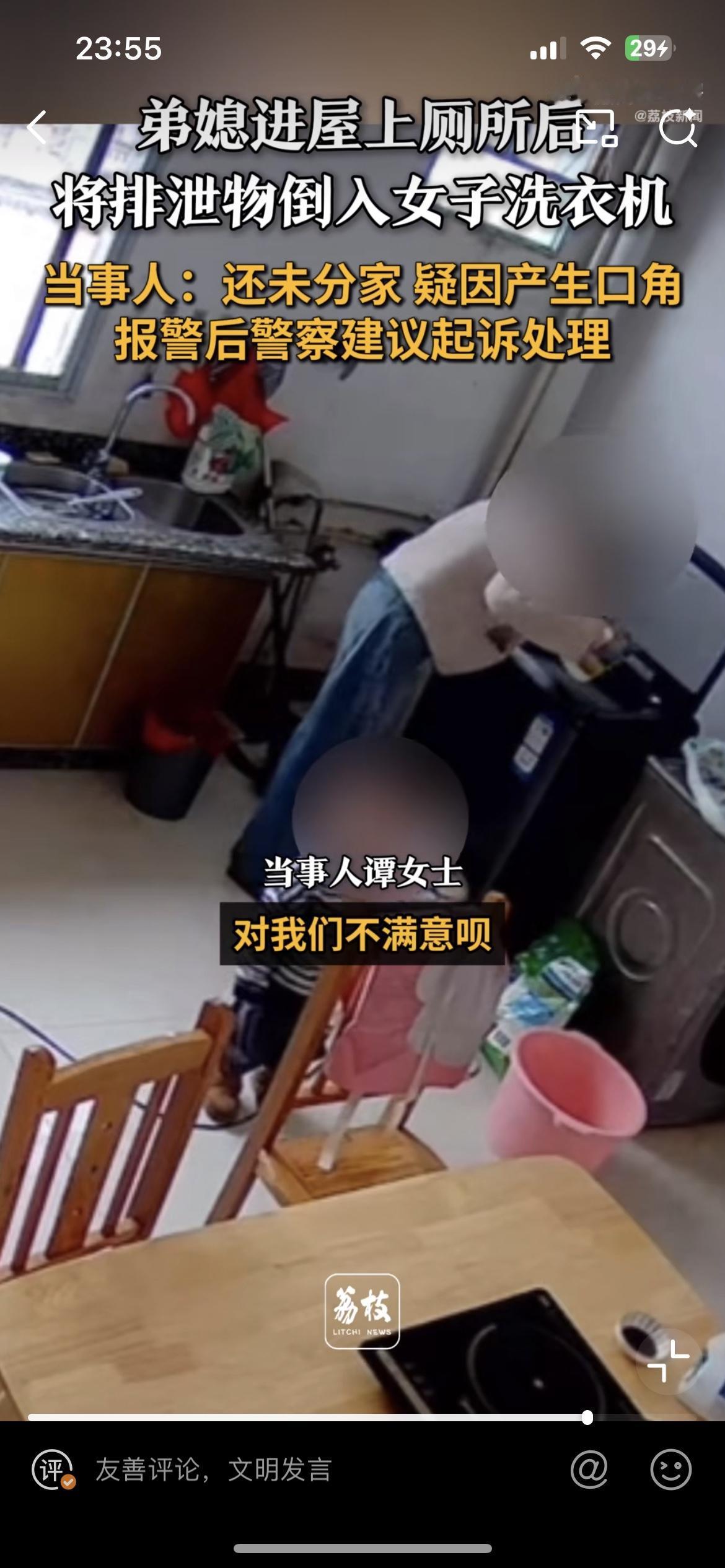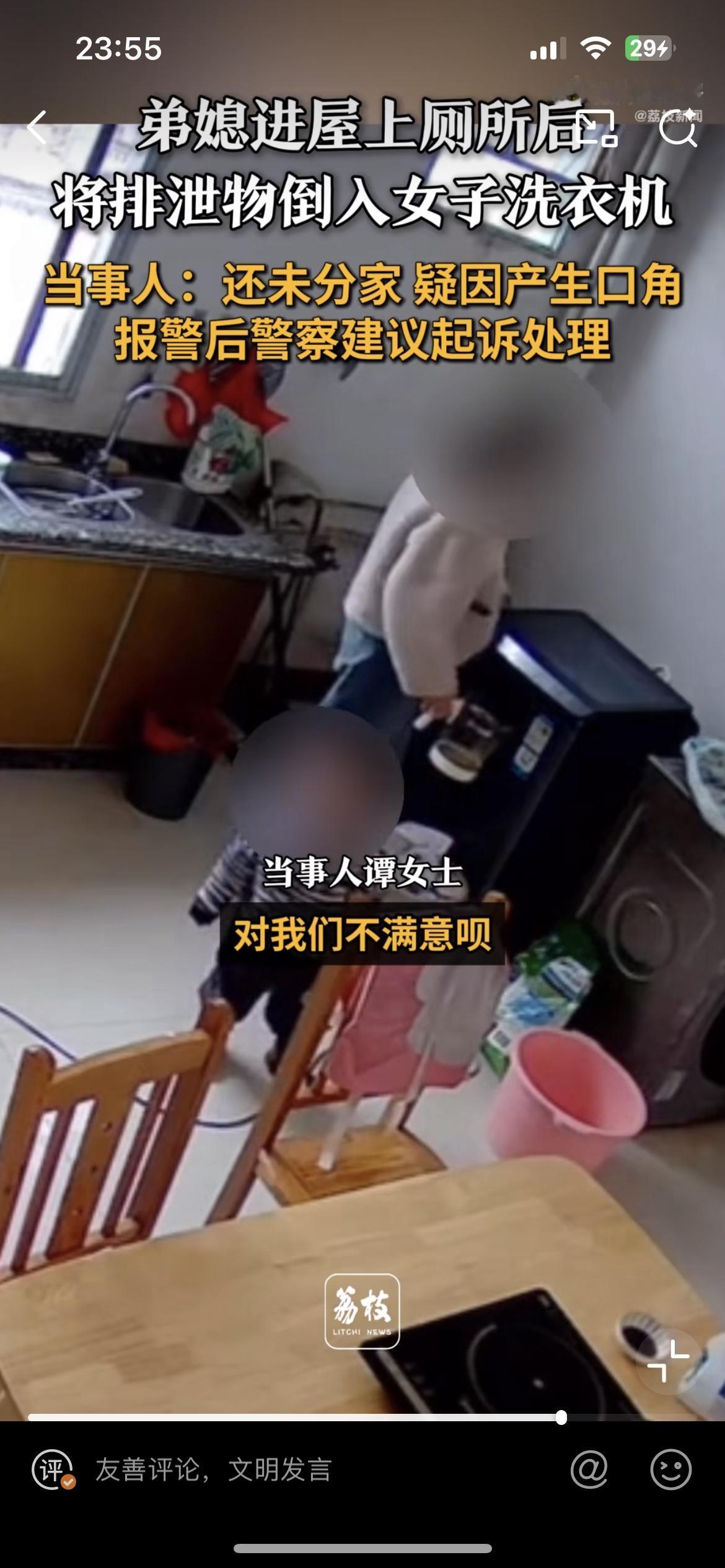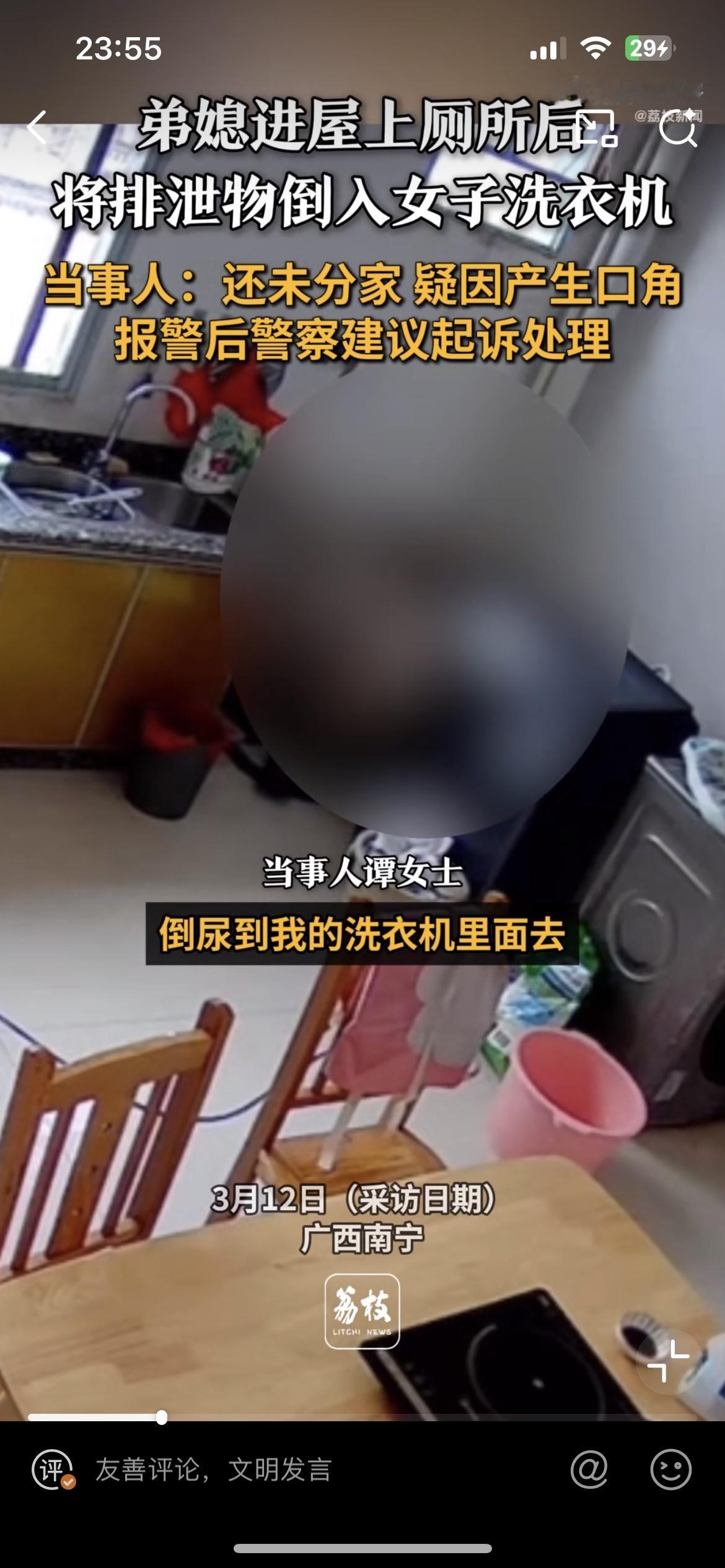 竟然有这么恶心的人,弟媳往嫂子洗衣机里面倒尿,就为了报复她。广西南宁的谭女士爆料,家里的洗衣机洗出来的衣服总有一股尿骚味,但总是找不到原因。后来在厨房装了监控,视频里面的恶心一幕简直让人惊掉下巴。只见弟弟的老婆在厨房拉尿,尿液全部倒到洗衣机里面,这台洗衣机正是她日常洗衣服用的。谭女士拿着监控视频去找弟媳妇对质,弟媳妇则称之前他们发生过矛盾。婆媳矛盾是天下第一难解的,妯娌矛盾可以排第二。