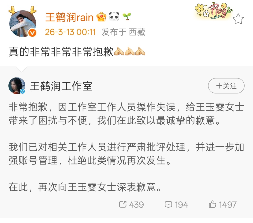 王鹤润工作人员操作失误王鹤润工作室工作人员操作失误 王鹤润IP在西藏,评论那条IP在上海,所以真是工作人员??王鹤润