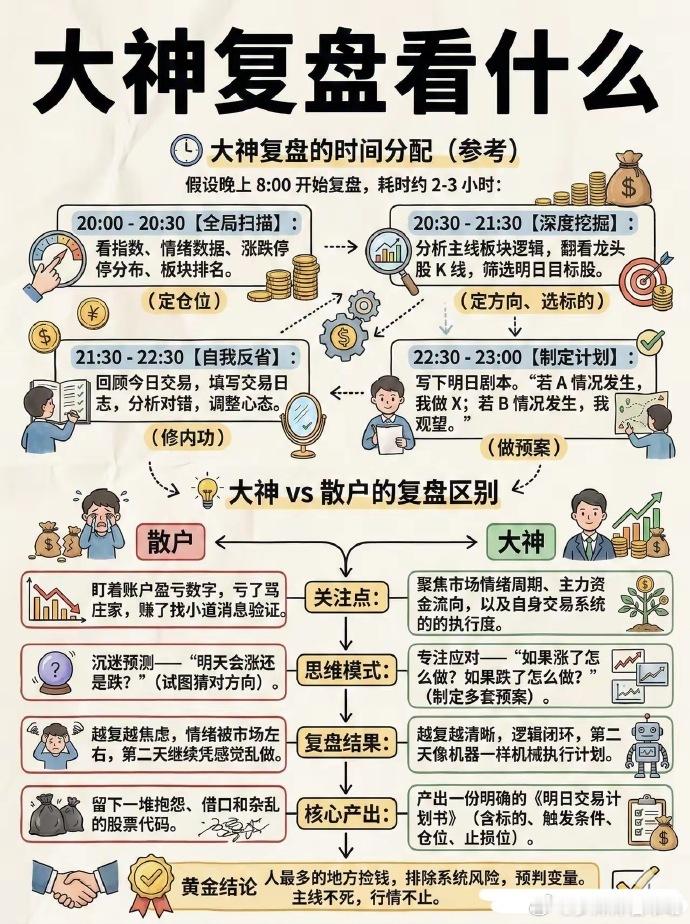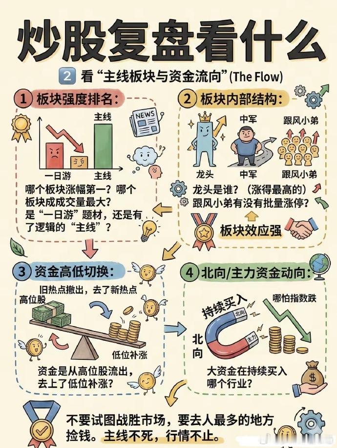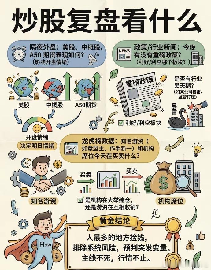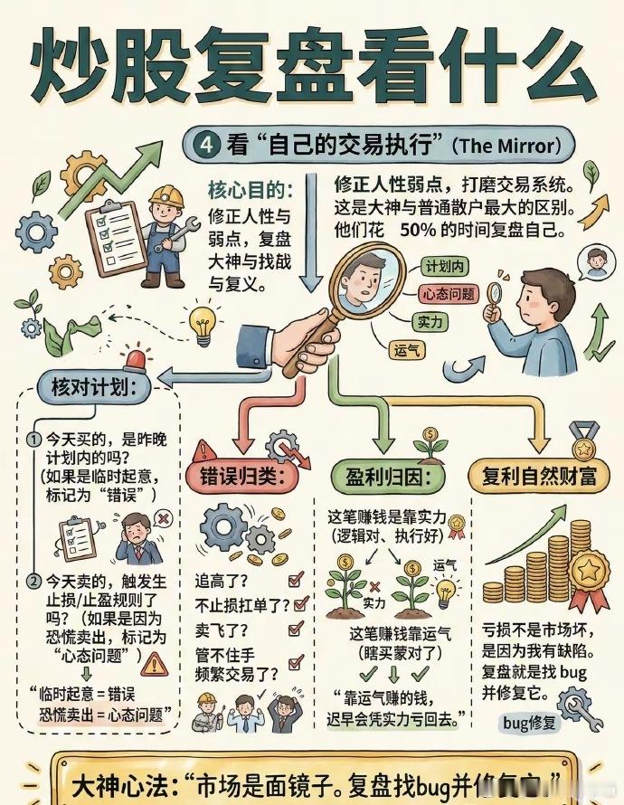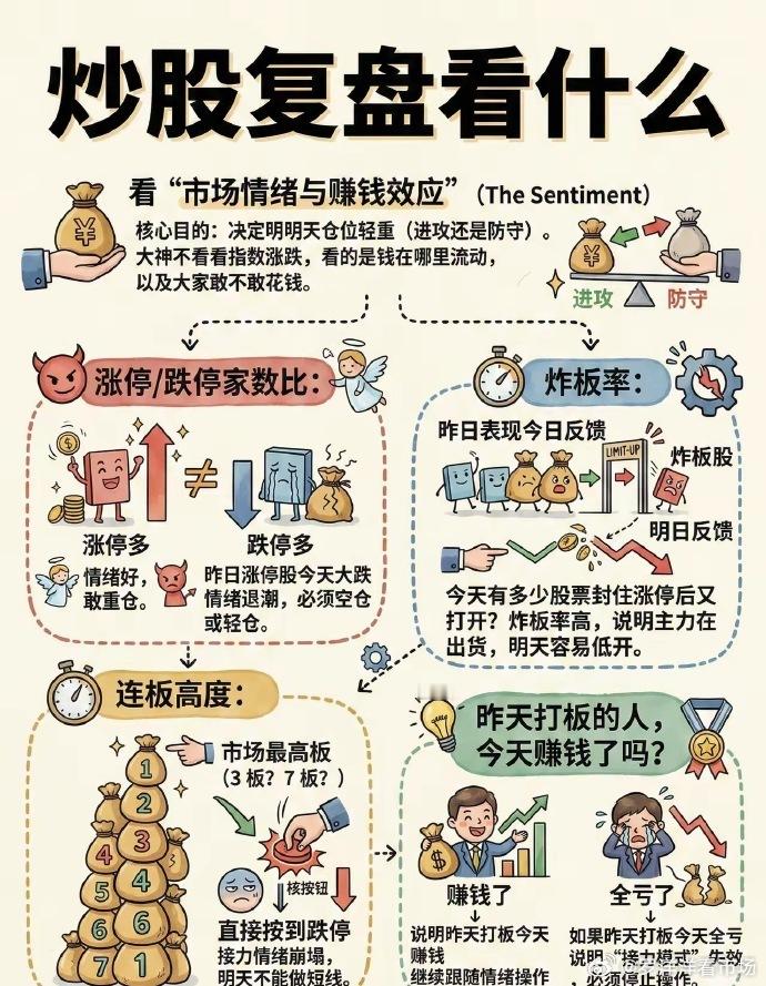 炒股复盘 1. 看大盘 今天强/弱?量能缩还是放?情绪是好是坏。 2. 看自己的票 - 为什么涨/跌? - 符合预期吗? - 明天是持有、减仓、加仓、止损?写清楚。 3. 看热点板块 今天谁领涨?资金在炒什么? 有没有持续性,还是一日游。 4. 看自己错在哪 买早了?卖飞了?追高了? 只记错误+下次怎么改。 5. 定明天计划 买什么、卖什么、止损位、仓位多少, 睡前写好,开盘不冲动。 一句话总结 复盘不是看涨跌,是找规律、改错误、定计划。 坚持一周,手感明显不一样。