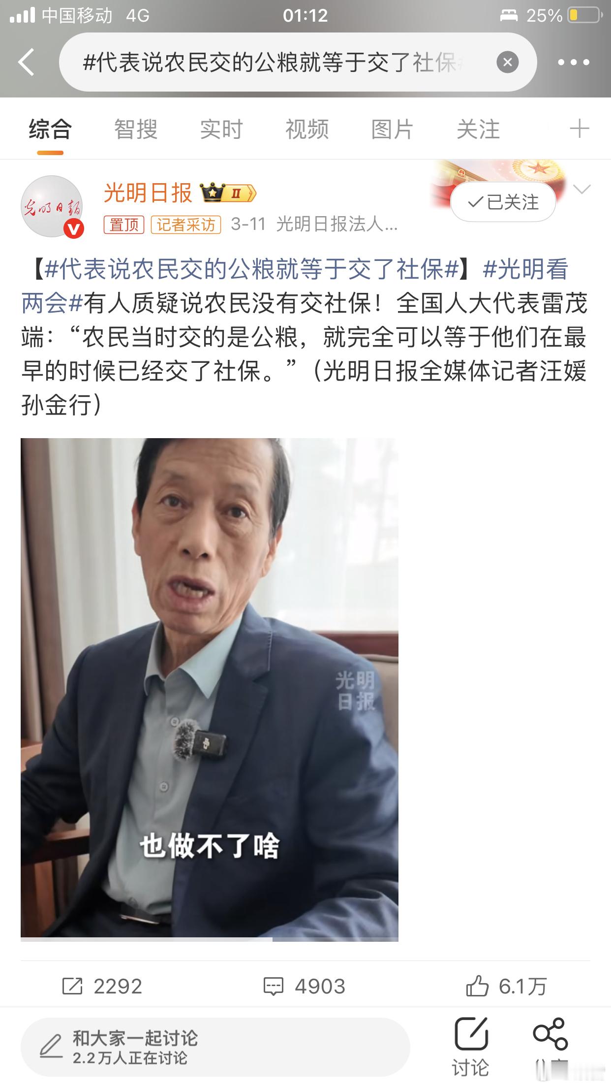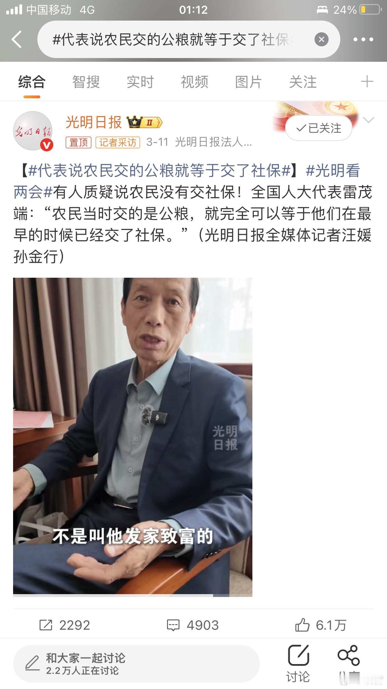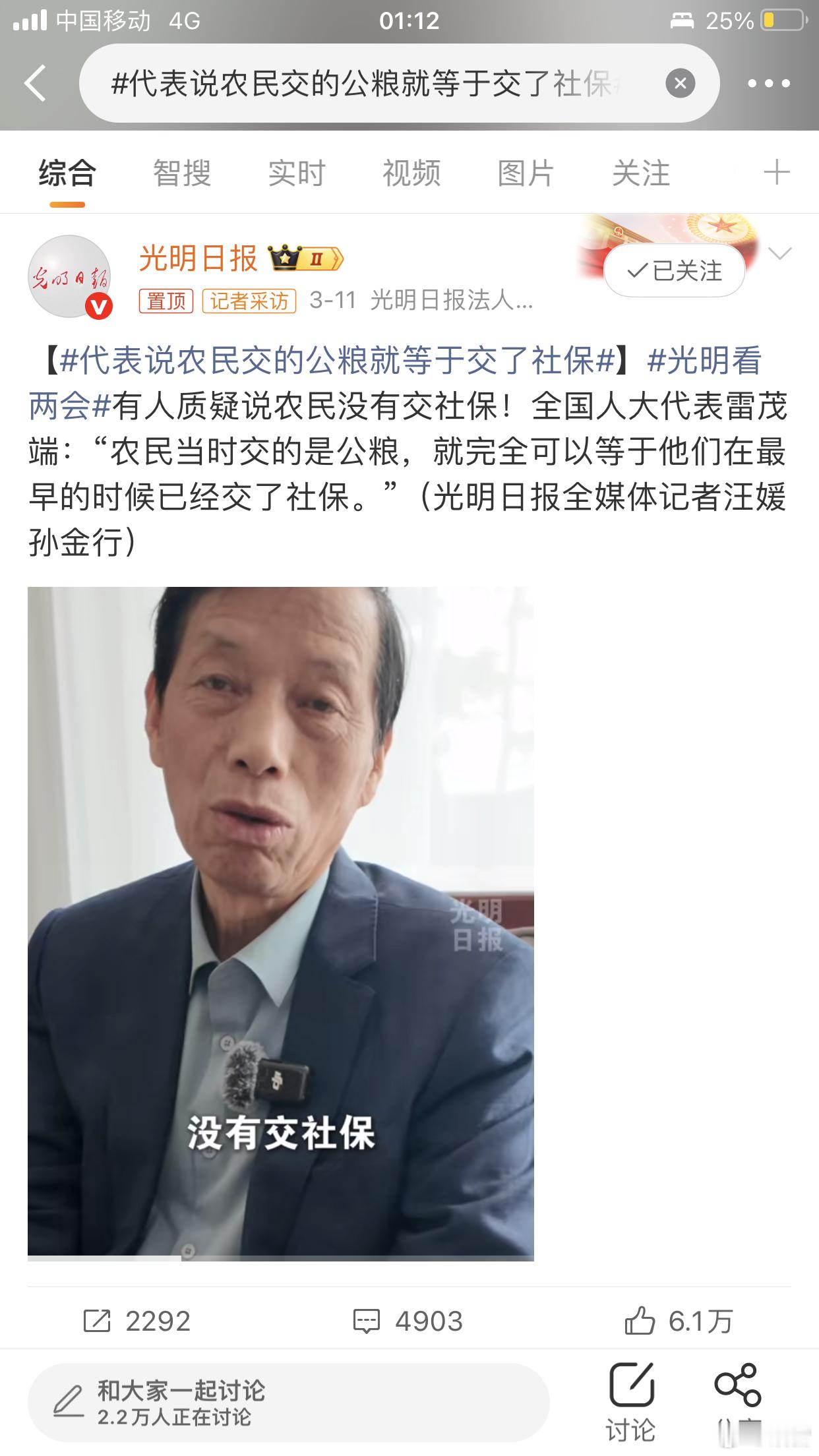 代表说农民交的公粮就等于交了社保建议国家高度关注农民的养老和医疗保障,让农民晚年更安心