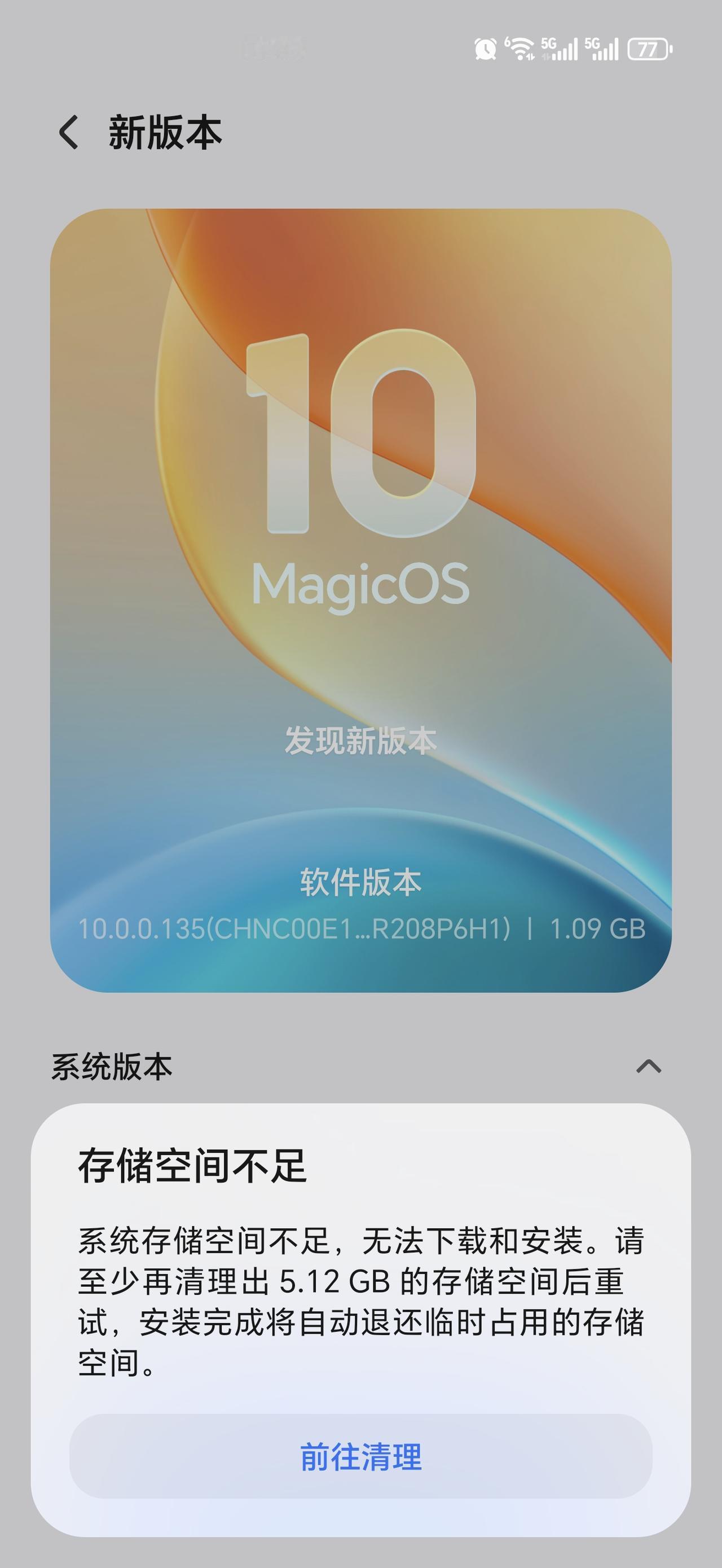 刚刚看到MagicOS 10又收到了推送更新,这次升级包版本是10.0.0.135(CHNC00E1XR208P6H1),升级包容量为1.09 GB,没有想到我手中的荣耀Magic5至臻版,居然还在更新范围内,这波升级灵动胶囊、截屏、控制中心、智慧多窗都有更新,流畅度更理想了,推荐升级,当然大家一定要注意,手机要有足够的空间,满足升级条件才可以 畅聊数码新品 数码资讯