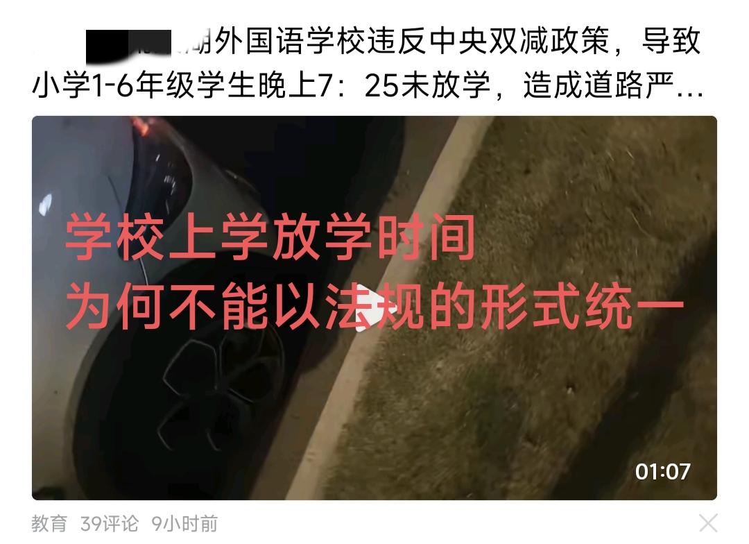 某市某小学违背双减规定,导致小学放学时间较晚,引起交通拥堵。刚才刷到这个视频,我就在想一个问题,同一座城市,每一所学校上学和放学时间是不一样的,有的早有的晚,有的学校非常卷时间,可能因为这个校长很卷。为什么一座城市的教育局,不能把本座城市小学初中上学(开校门时间)和放学时间完全统一,而任由每所学校自主决定上学放学时间,有人说这是学校办学的自主权,教育局不能干涉太多。我觉得上学放学时间,教育局必须干涉统一,不能提前上学也不能拖后放学,每一所学校做到一致,就不会出现个别校长极度卷时间的现象。教育