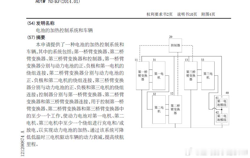 专利要解决的,就是低温下三电机驱动车辆动力衰减、续航下降的问题。这套系统的基本结构是啥呢?第一桥臂变换器连第一电机,第二桥臂变换器连第二电机,第三桥臂变换器连第三电机,控制器负责控制这些桥臂工作,让动力电池对电机绕组进行充电和/或放电,从而实现电池加热。
