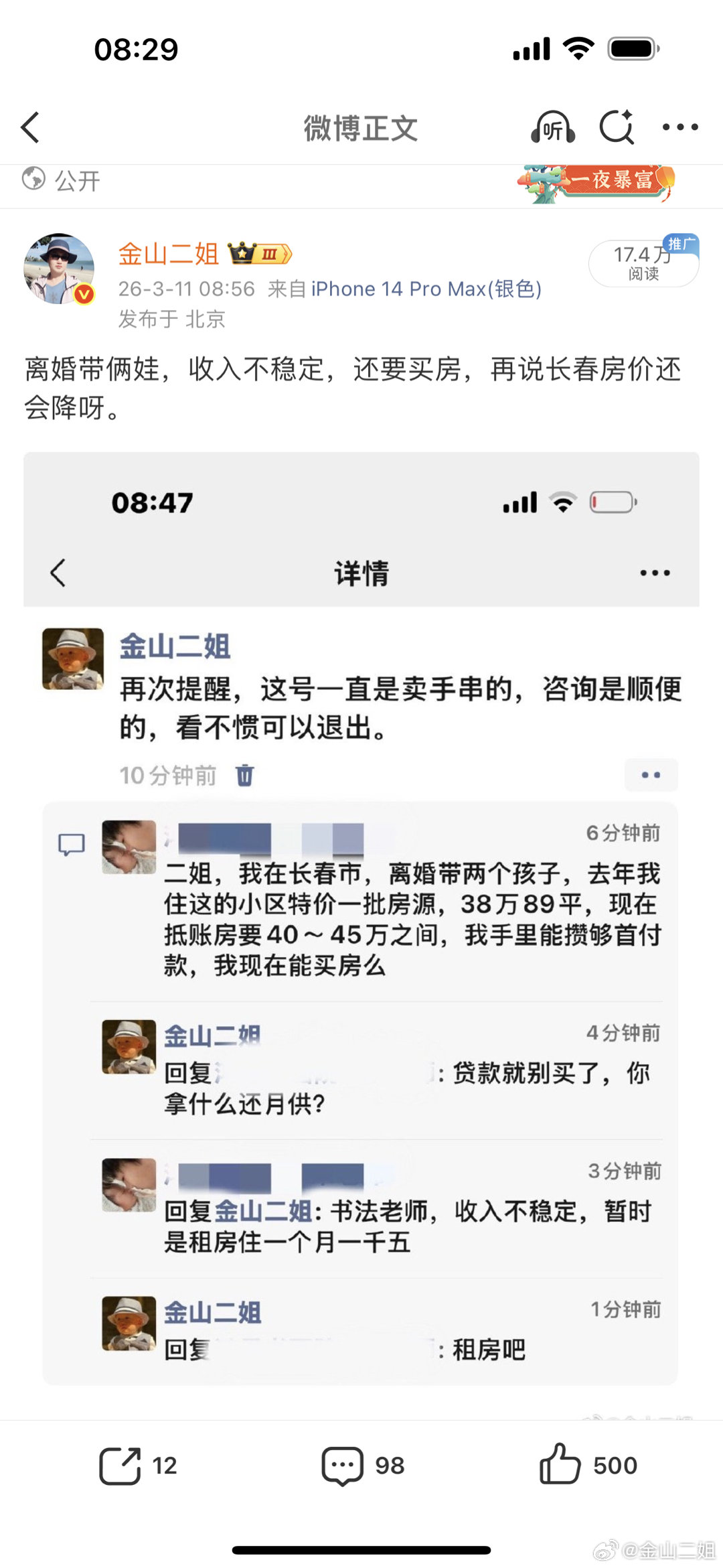 我为什么说你现在不适合买房?1、买这个房子用了你现有的现金,两个孩子和你有个灾有个病怎么办?2、月供还款是需要稳定的收入的,不能光看月供和租金差不多就觉得这样合适;3、长春房市一直是弱市,城市人口负增长,二手房市场供应量大,没必要着急买房。我倒觉得你可以考虑带着孩子闯闯海南,比长春好多了。