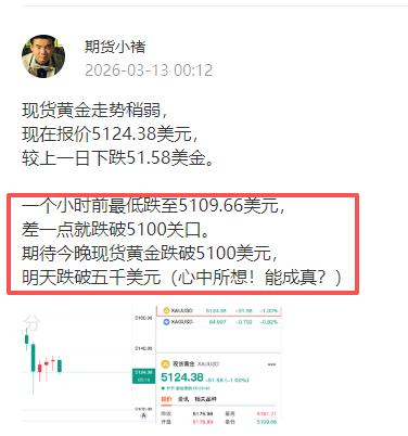 蒙对了, 半夜12点多, 发了一个动态, 说期待金价跌破五千一百美元, 明天跌破五千美元。 早上一看, 半夜金价真的跌破5100了, 最低更是跌至5055美元(如下图)。 那么还会不会跌破五千美元? 期待中....