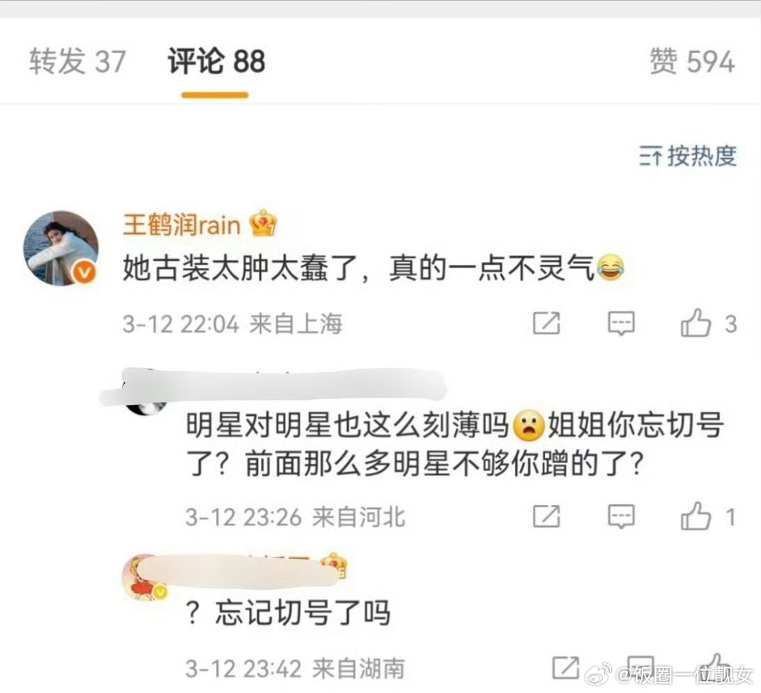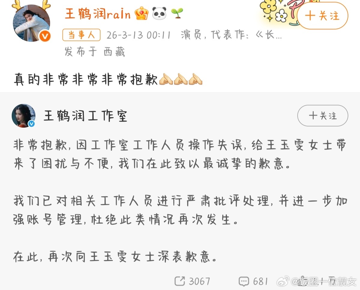 王鹤润吐槽王玉雯又事后道歉,说是工作人员的失误,但吐槽王玉雯是事实,不管怎么说作为公众人物也应该管理好自己的人吧。这波王玉雯粉丝怎么看