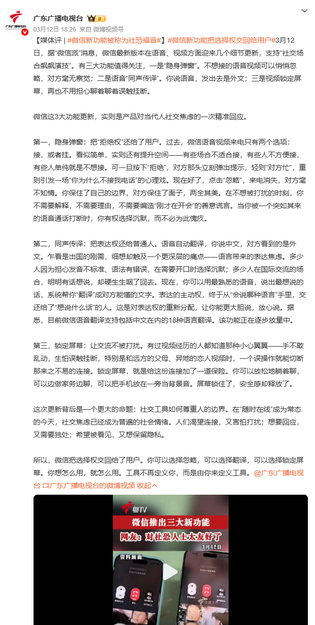 微信新功能被称为社恐福音微信新功能为何被称“社恐福音”?面对不想接的语音/视频,点击“忽略”即可“假装没看见”,既守住自身边界又维护对方面子;跨语言沟通时,语音转文字同声传译让你用乡音说想说的话,系统自动翻译成对方能懂的文字,表达权重新回归用户;视频通话锁定屏幕,再不怕误触挂断,让交流更安心。这些功能精准回应当代人社交焦虑,让数字生活更有温度。