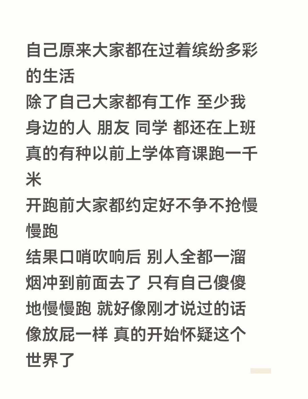 小红书上的失业到底有多少是真失业… 的帖子给人一种虚假的安慰感 因为失业躺平焦虑把这个平台当树洞用 也经常搜一些和自己现状类似的帖子寻求方法和安慰 看多了也有了信息茧房 首页也是经常推送裸辞 待业 家里蹲等字眼的帖子 久而久之把自己也欺骗了 原来这么多人都没上班 焦虑看似有所缓解 但是回归现实后发现除了自己原来大家都在过着缤纷多彩的生活 除了自己大家都有工作 至少我身边的人 朋友 同学 都还在上班 真的有种以前上学体育课跑一千米 开跑前大家都约定好不争不抢慢慢跑 结果口哨吹响后 别人全都一溜烟冲到前面去了 只有自己傻傻地慢慢跑 就好像刚才说过的话像放屁一样 真的开始怀疑这个世界了22届毕业生 失业后的状态 工作迷茫中 就业大环境