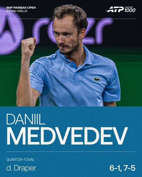 印第安维尔斯大师赛,梅德韦杰夫以6-1/7-5终结了德雷珀的卫冕之旅,连续四年打进本赛事四强。