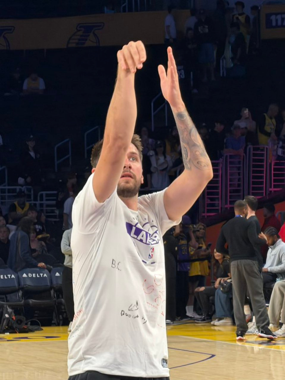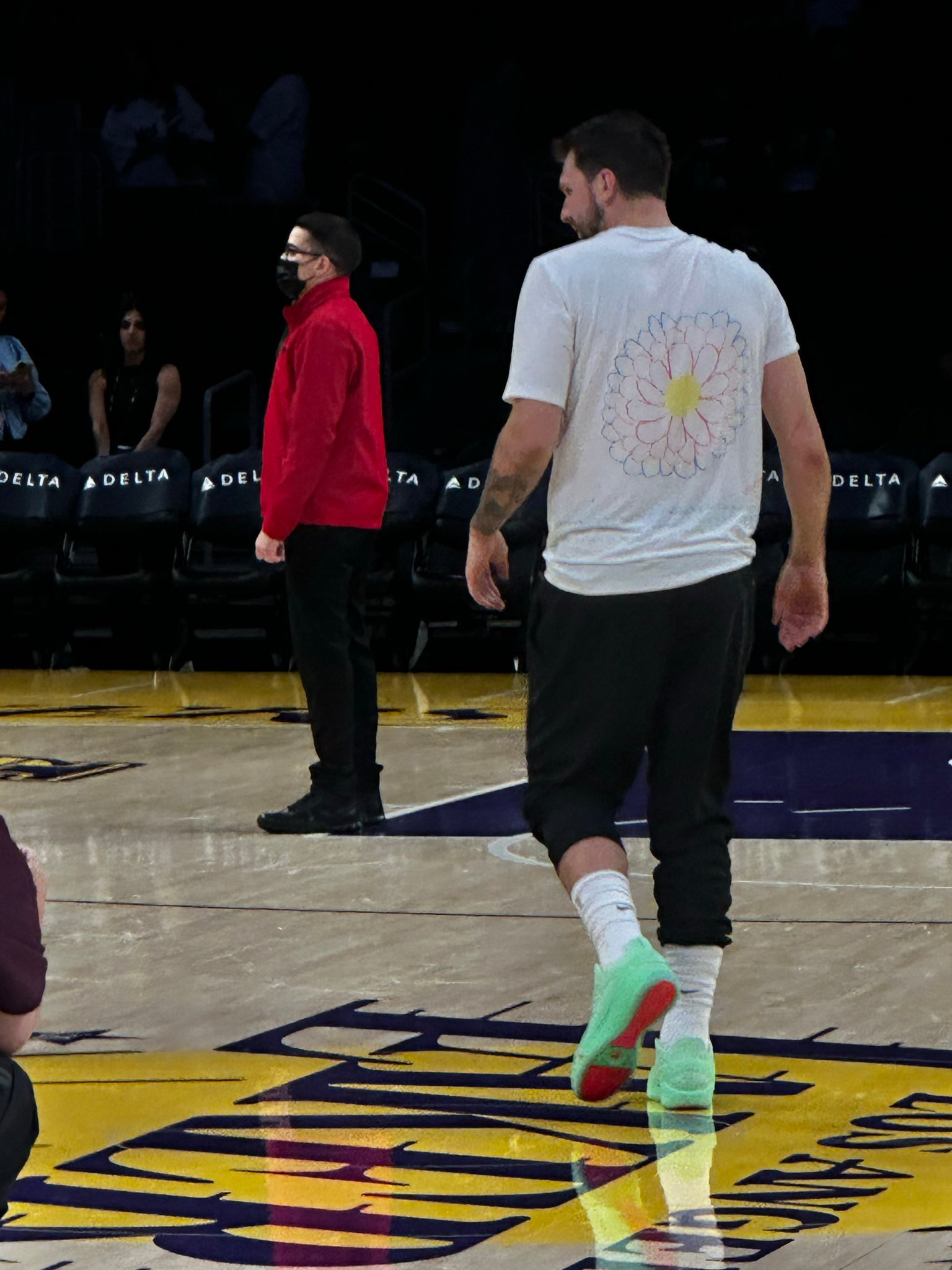 东契奇今天热身穿着昨天UCLA Health孩子给他签名的那件T恤。湖人 v
