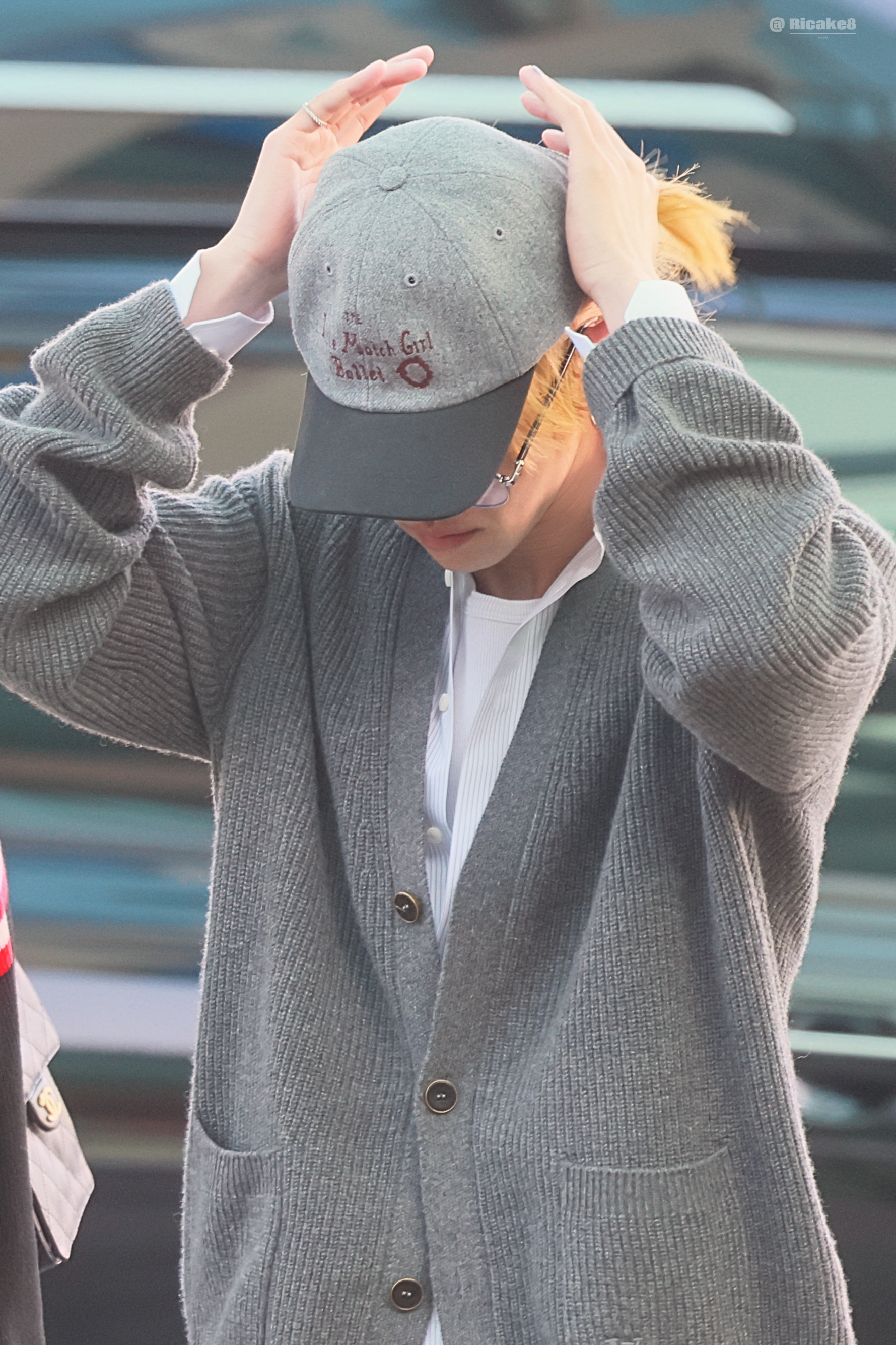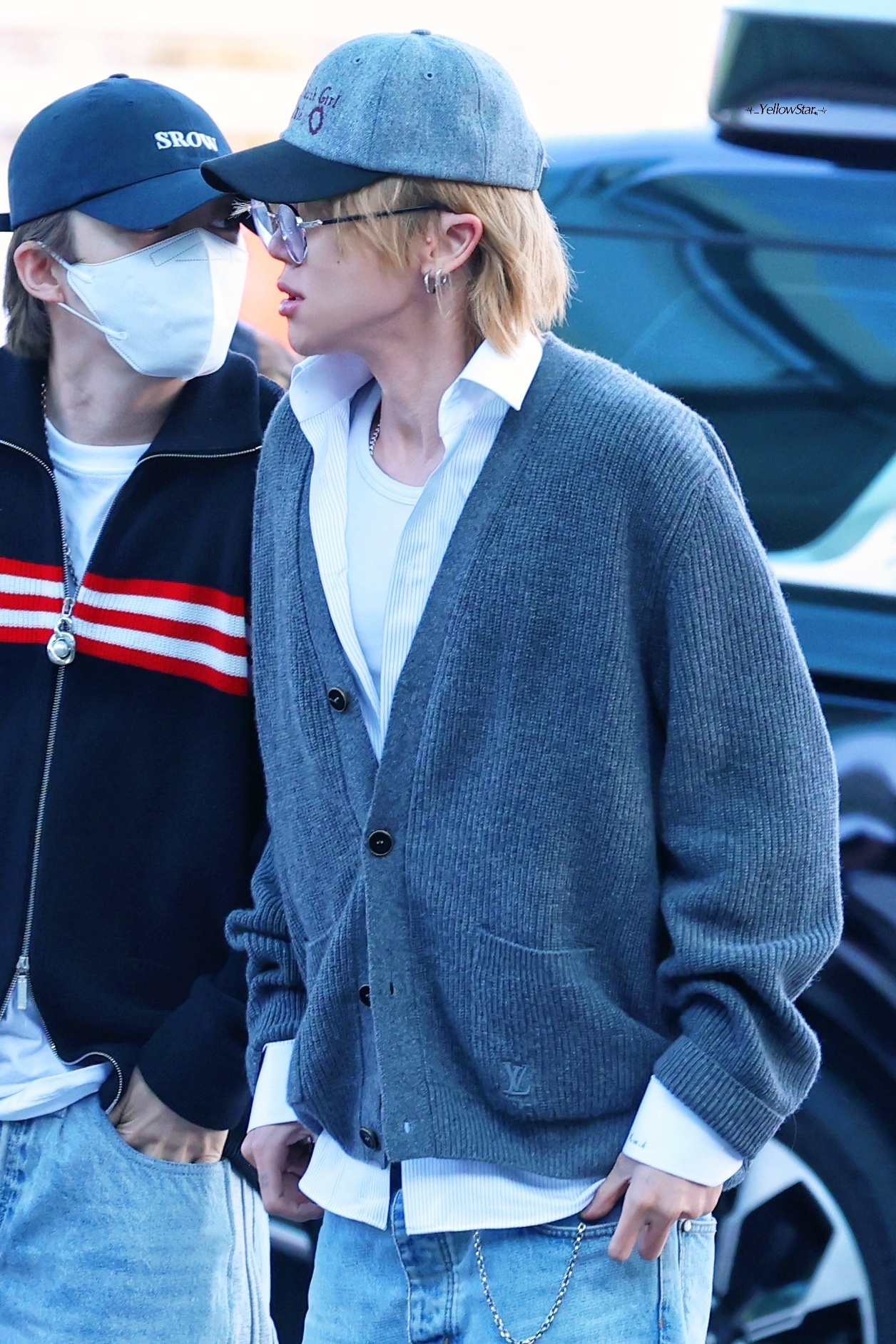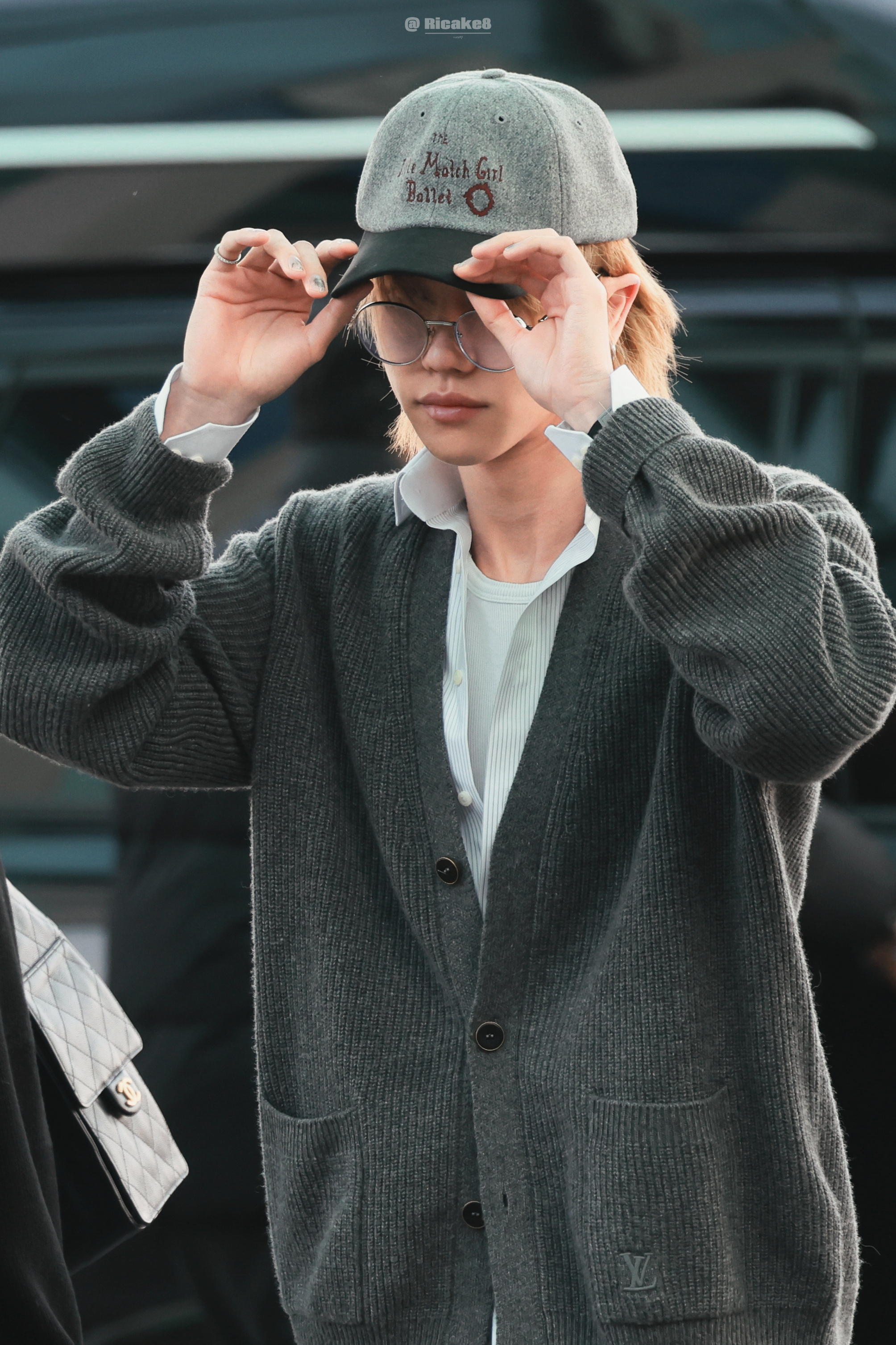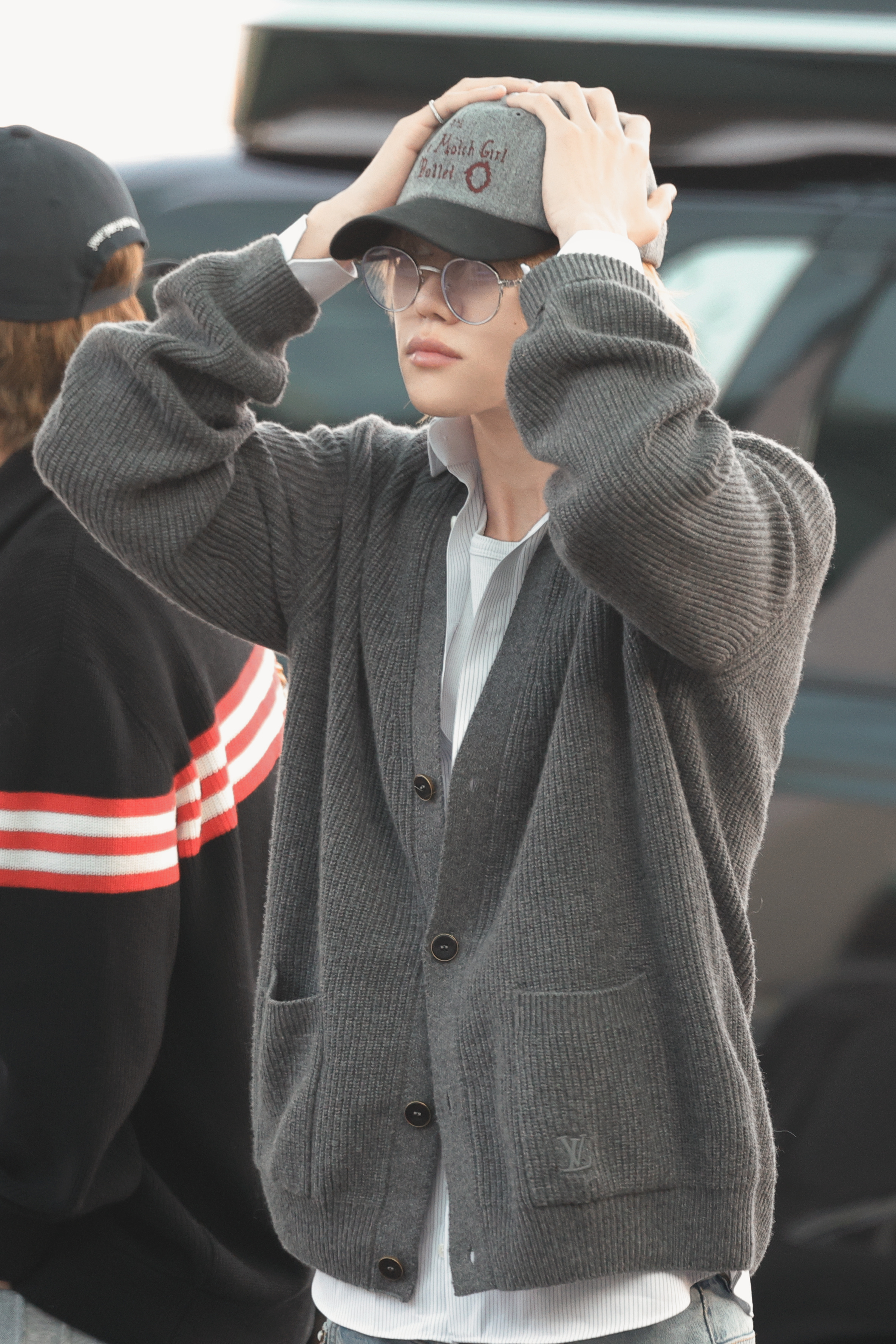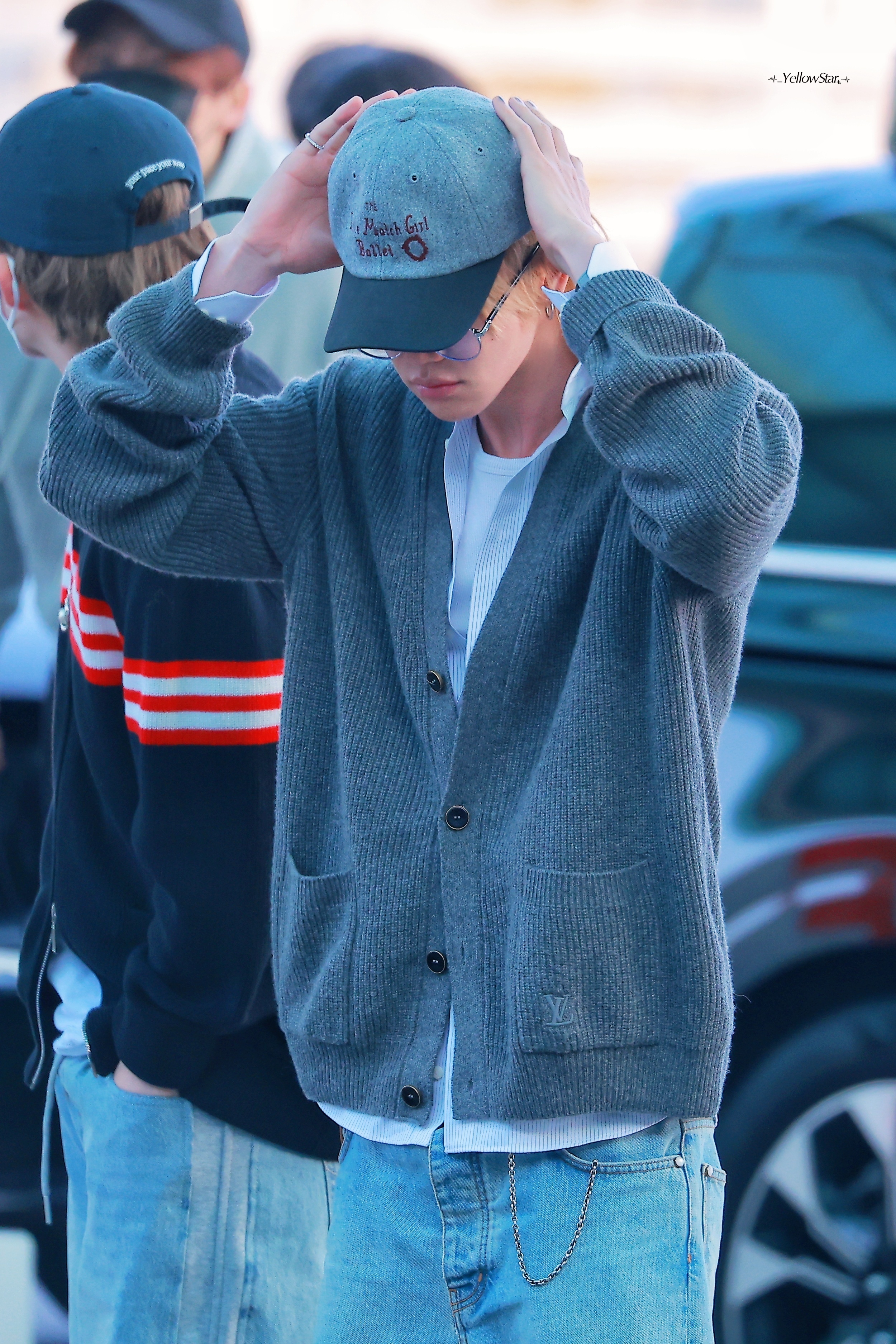 造型选用 Louis Vuitton 羊绒开衫与经典牛仔裤组合,配以棒球帽及细框眼镜,整体风格轻松又不失书卷气。徐明浩机场出发