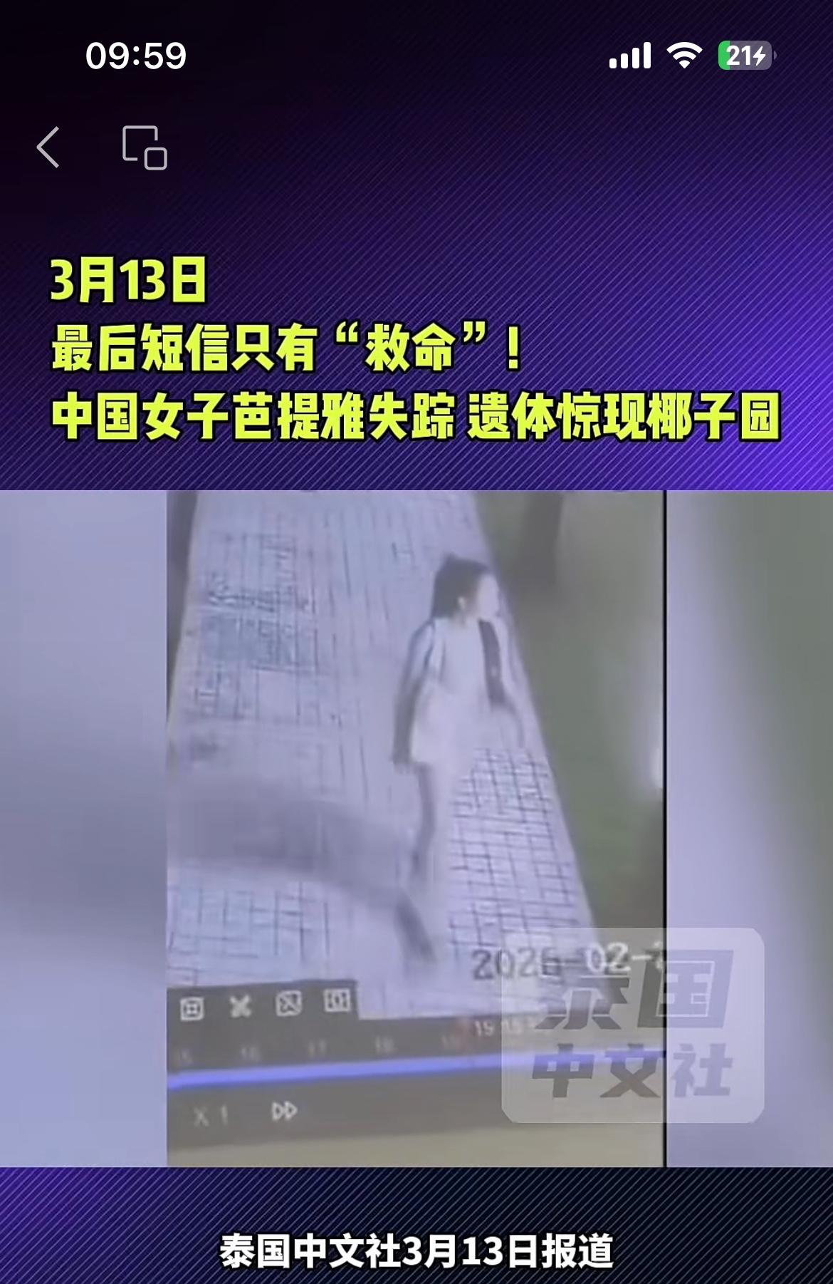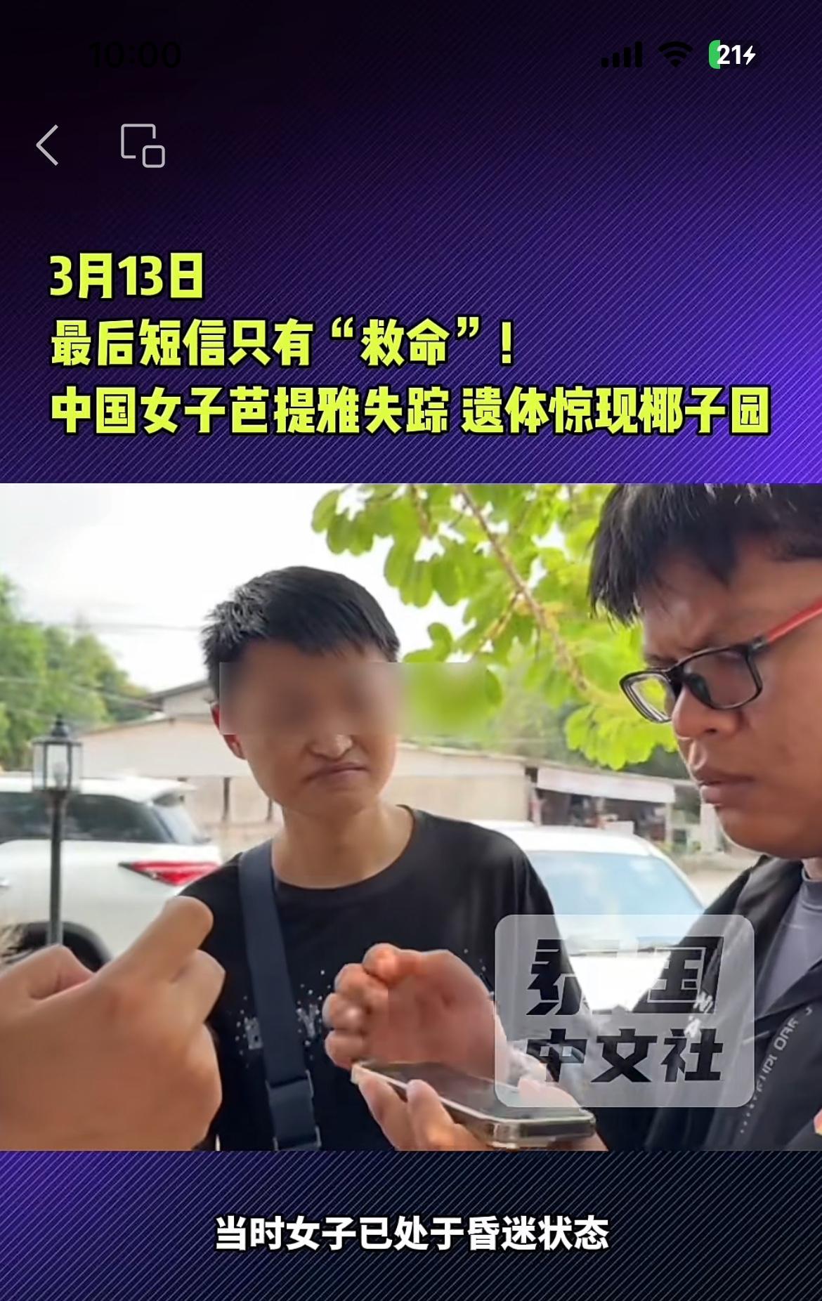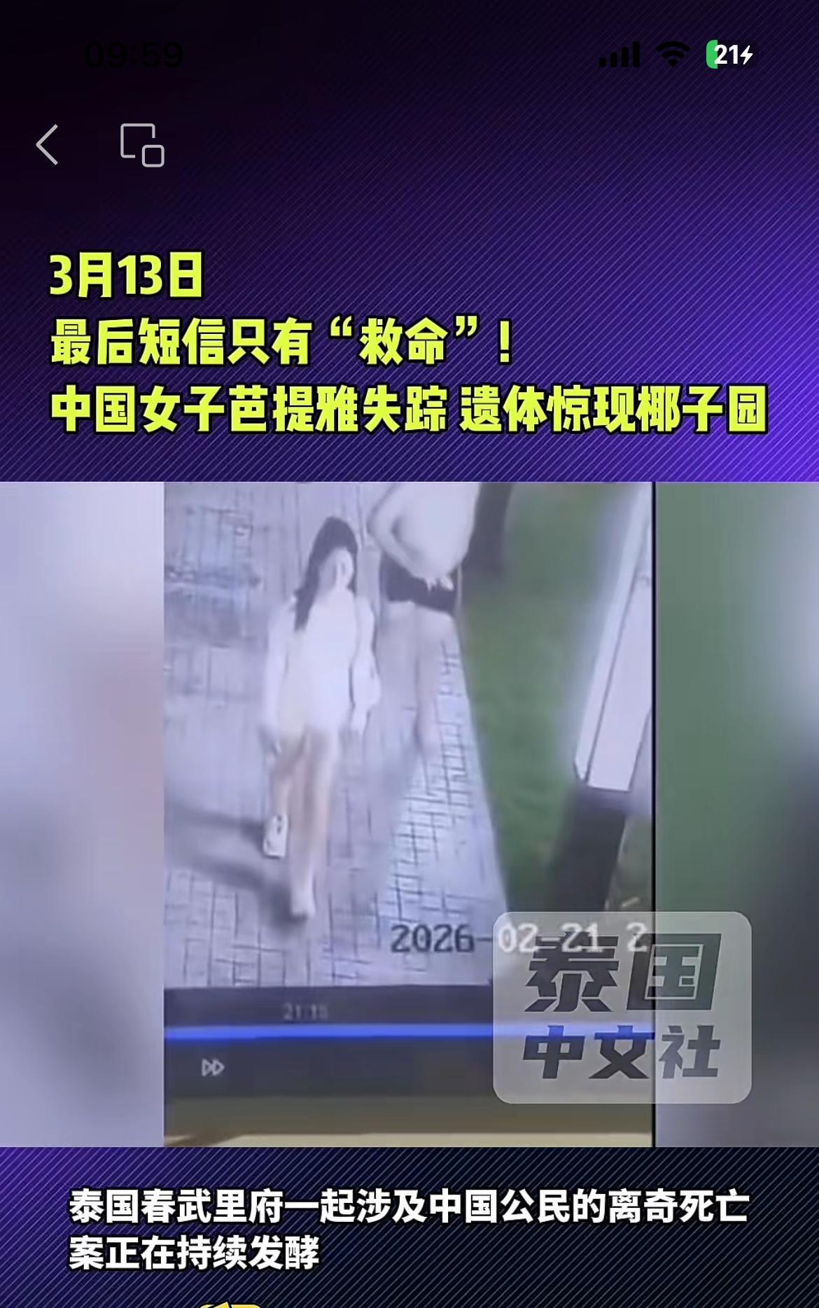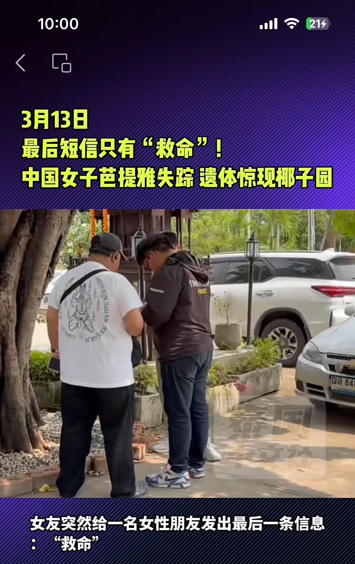 一安徽女子在泰国芭提雅遇害,身亡前发出神秘救命短信。该名女子姓计,31 岁,在芭提雅一家娱乐场所工作。2 月 21 日,收到一通电话邀约,去往芭提雅一别墅提供服务。因为对方说的是中文,女子觉得是同乡,放松了警惕。从监控画面显示,女子进入别墅区,神情自若,在头几个小时内也和里面的客人有说有笑,相当放松。后面一名男子带着纪某离开,此时的计某看起来神情有一点恍惚,他们走出别墅后迅速上了一辆小车,往泰国拉差里府方向。计某的同事见她一夜未归,于是选择报警。多天后,泰国拉差里府一农民报警,称在水塘水塘里发现一具女尸,经过 DNA 比对,证实是失踪多天的计某。计某相恋 4 年的男友接到信息后从中国赶往泰国,协助警方调查,处理后事。