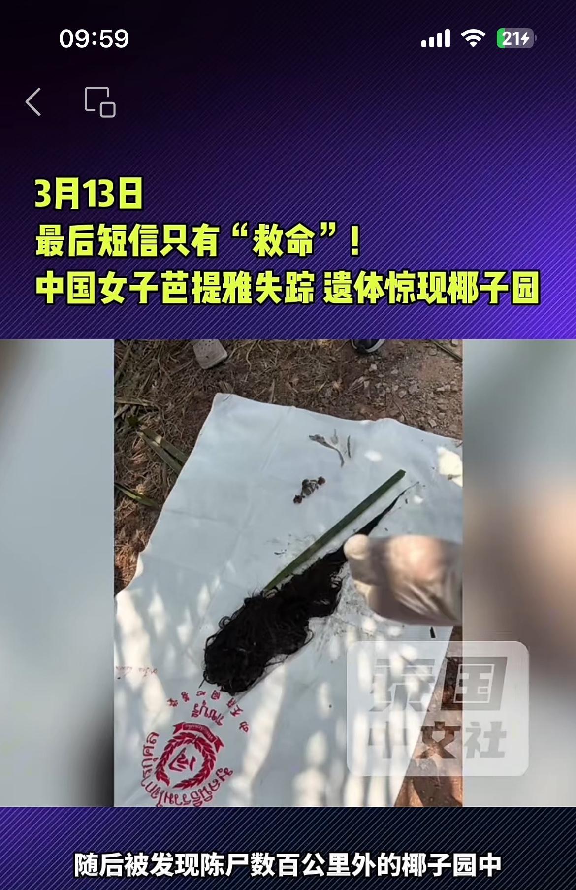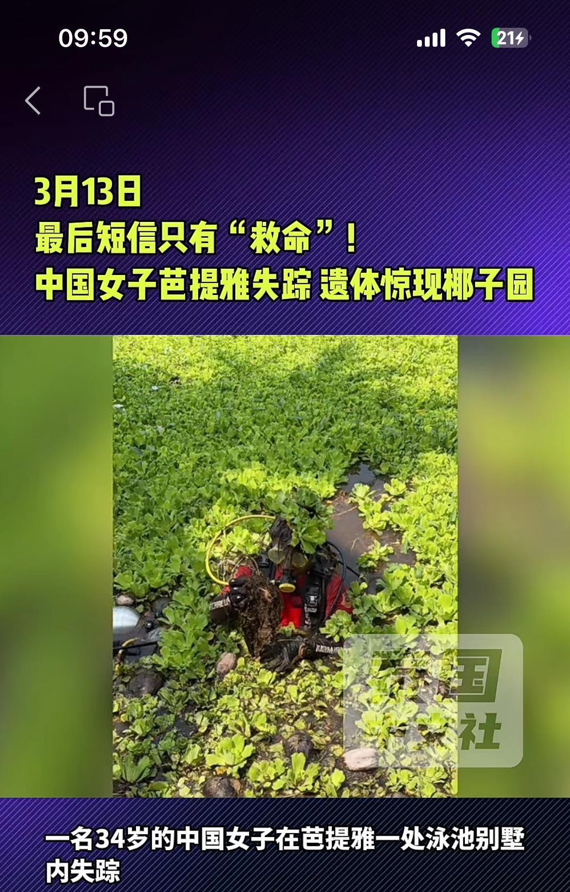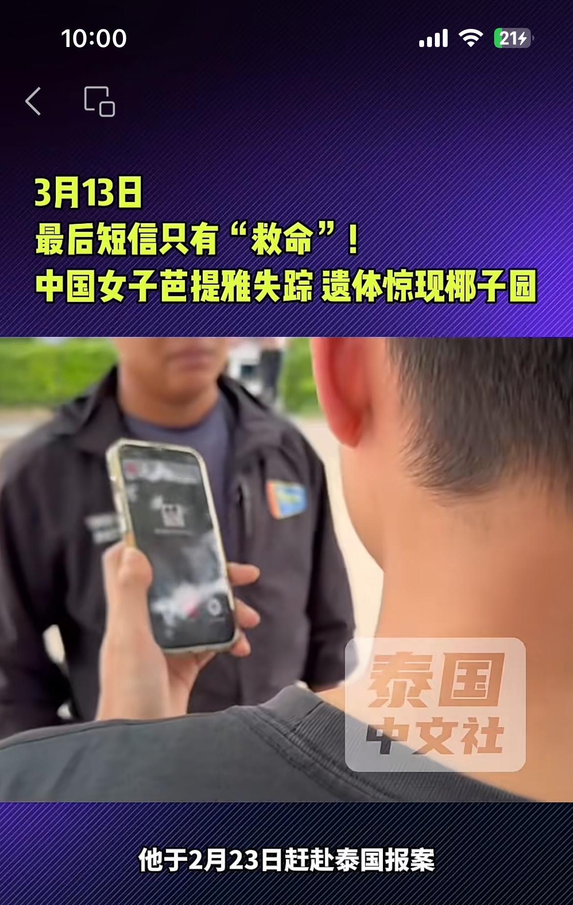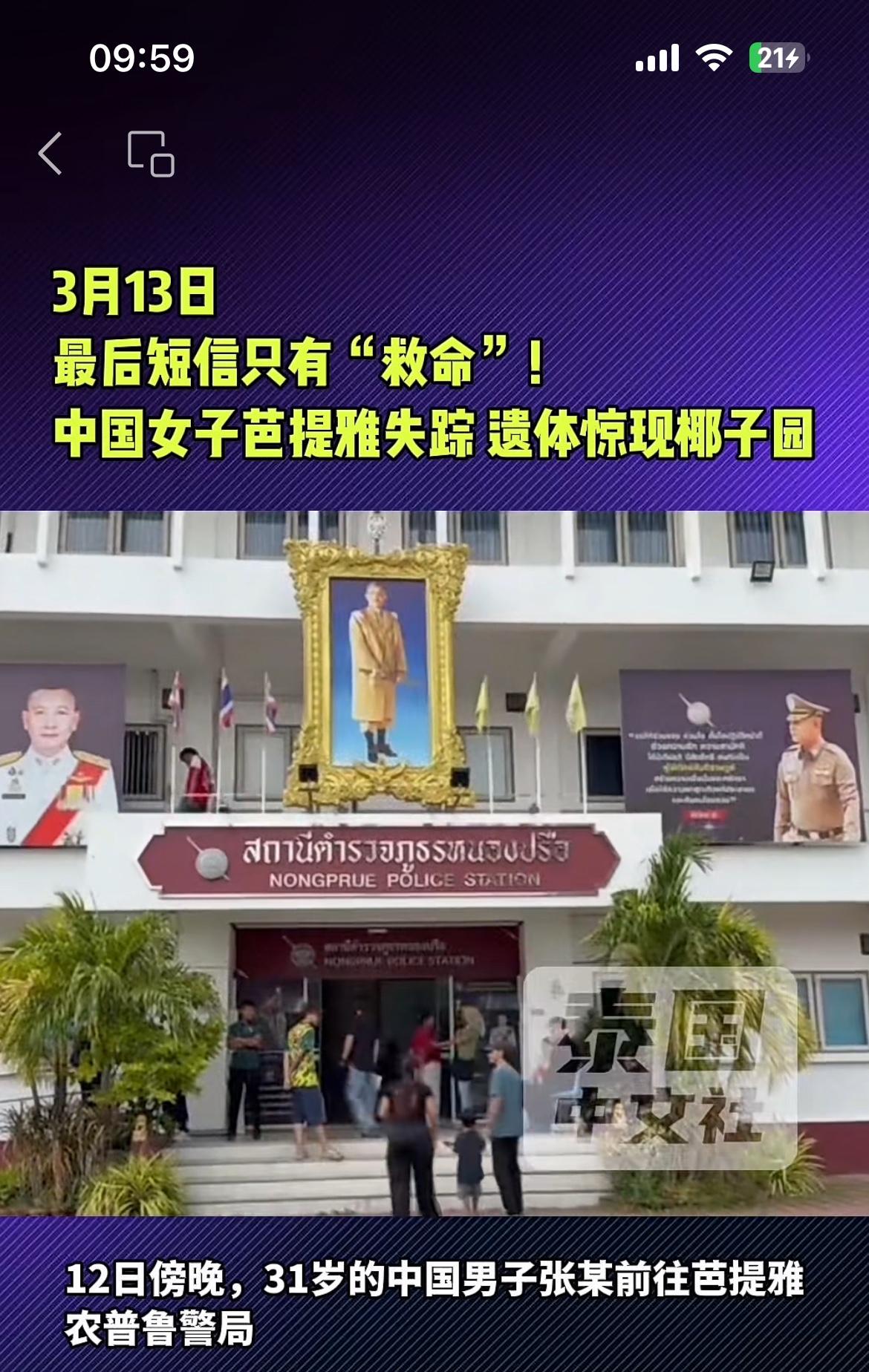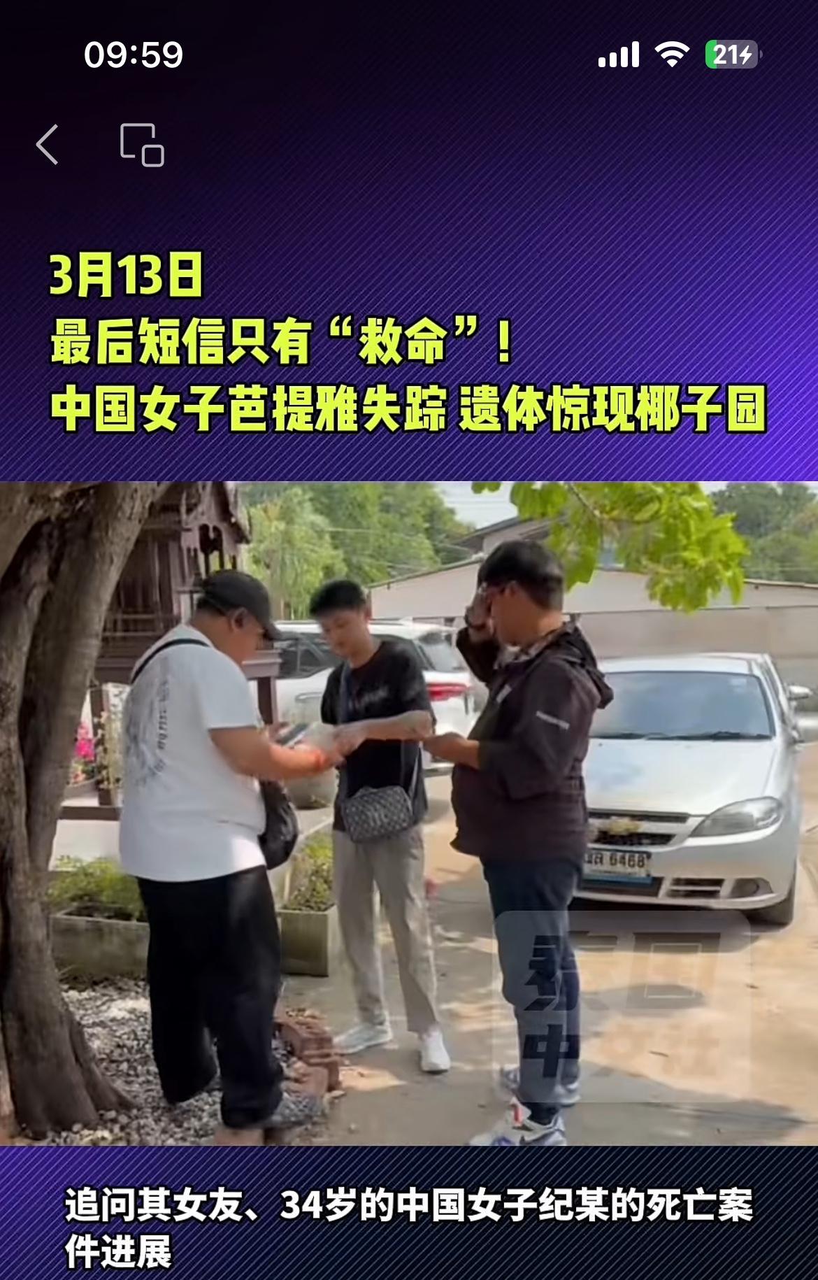 一安徽女子在泰国芭提雅遇害,身亡前发出神秘救命短信。该名女子姓计,31 岁,在芭提雅一家娱乐场所工作。2 月 21 日,收到一通电话邀约,去往芭提雅一别墅提供服务。因为对方说的是中文,女子觉得是同乡,放松了警惕。从监控画面显示,女子进入别墅区,神情自若,在头几个小时内也和里面的客人有说有笑,相当放松。后面一名男子带着纪某离开,此时的计某看起来神情有一点恍惚,他们走出别墅后迅速上了一辆小车,往泰国拉差里府方向。计某的同事见她一夜未归,于是选择报警。多天后,泰国拉差里府一农民报警,称在水塘水塘里发现一具女尸,经过 DNA 比对,证实是失踪多天的计某。计某相恋 4 年的男友接到信息后从中国赶往泰国,协助警方调查,处理后事。
