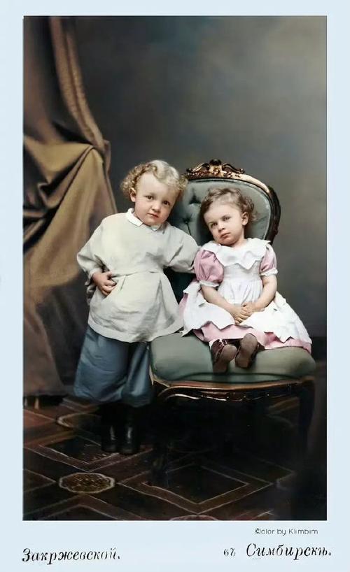 这是弗拉基米尔·列宁现存最早的童年合影之一,拍摄于1874年的俄国辛比尔斯克(今乌里扬诺夫斯克),记录了4岁的列宁与他年幼的妹妹奥尔加。 左侧是弗拉基米尔·伊里奇·乌里扬诺夫(列宁),时年4岁,后来成为俄国布尔什维克革命领袖、世界上第一个社会主义国家的缔造者。右侧是奥尔加·乌里扬诺娃,列宁的妹妹,当时年仅1岁。 此时的他还叫“沃洛佳”,在辛比尔斯克度过了无忧无虑的童年,父亲是当地的学校督学,家庭氛围温暖和睦。他还不知道,自己未来会领导十月革命,推翻沙皇统治,建立苏维埃政权,彻底改变俄国乃至世界的历史走向。妹妹奥尔加后来也投身革命事业,成为列宁的重要支持者,这张照片正是他们一生手足情谊的最初见证。