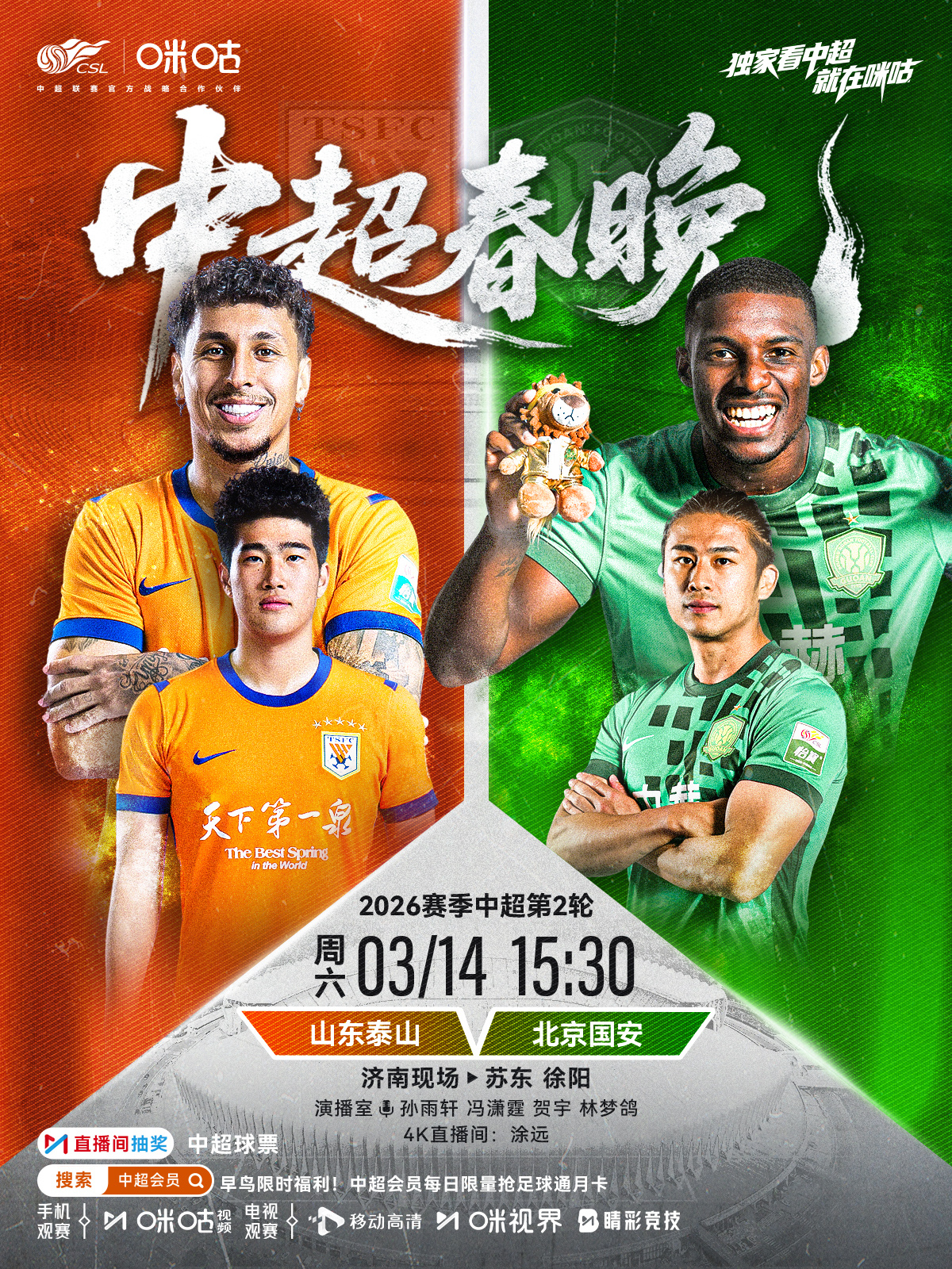 𝑪𝑺𝑳 《中超春晚》⚽️ 2026中超联赛第二轮🏟️ 山东泰山 对阵 北京国安 ⏰ 3/14周六 15:30 不见不散👀 #独家看中超就在咪咕# 网页链接